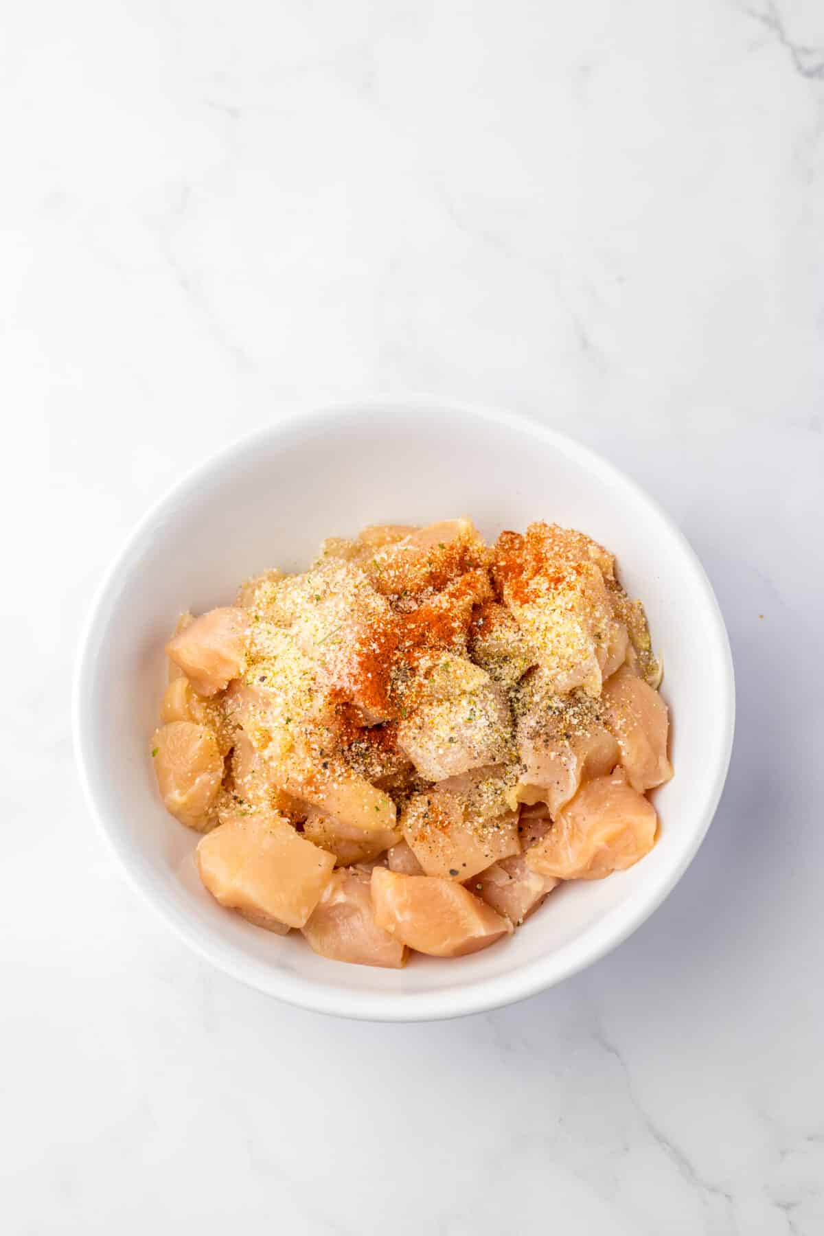 In a bowl, toss the diced chicken with black pepper, paprika, garlic powder, and salt until evenly coated.