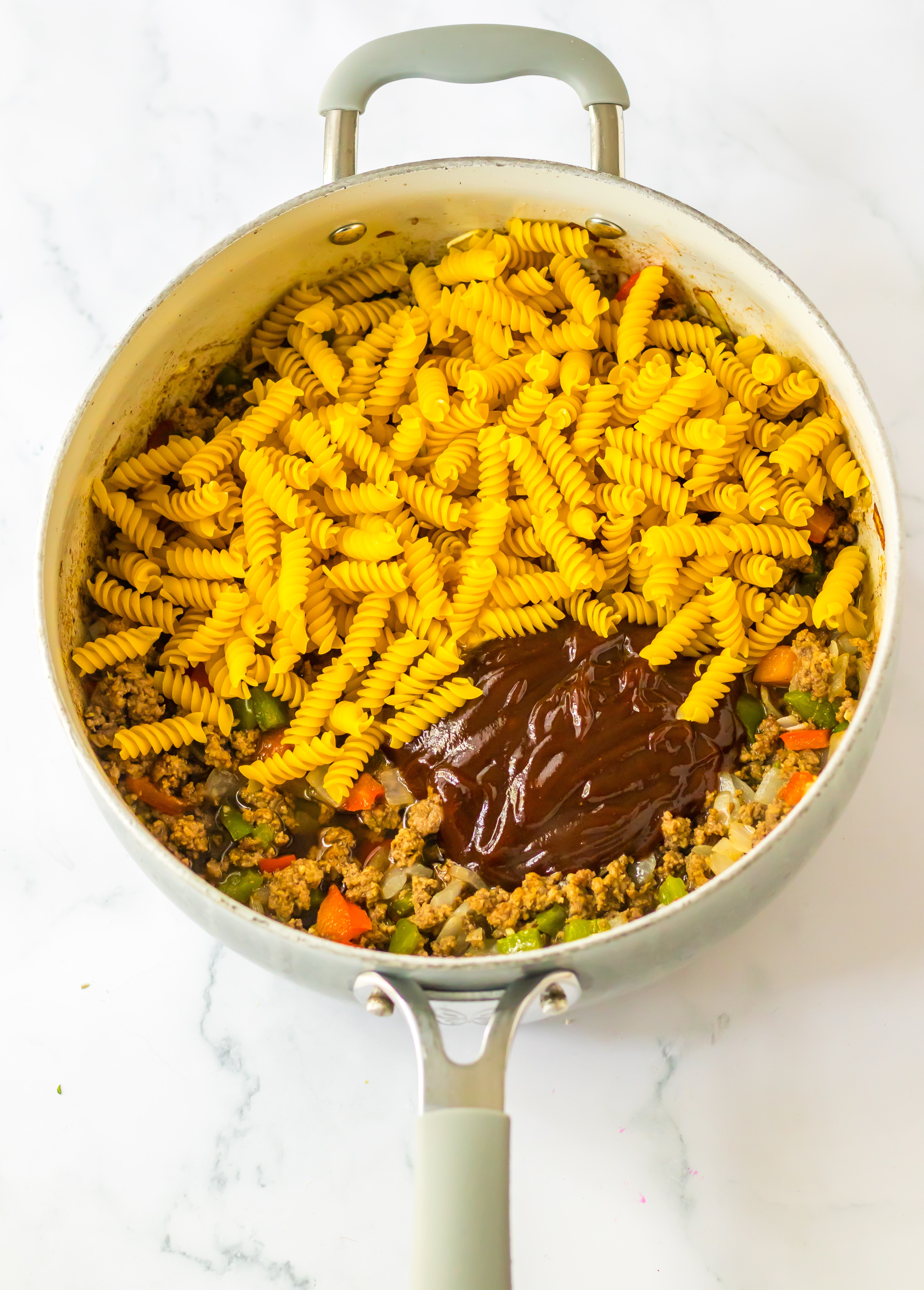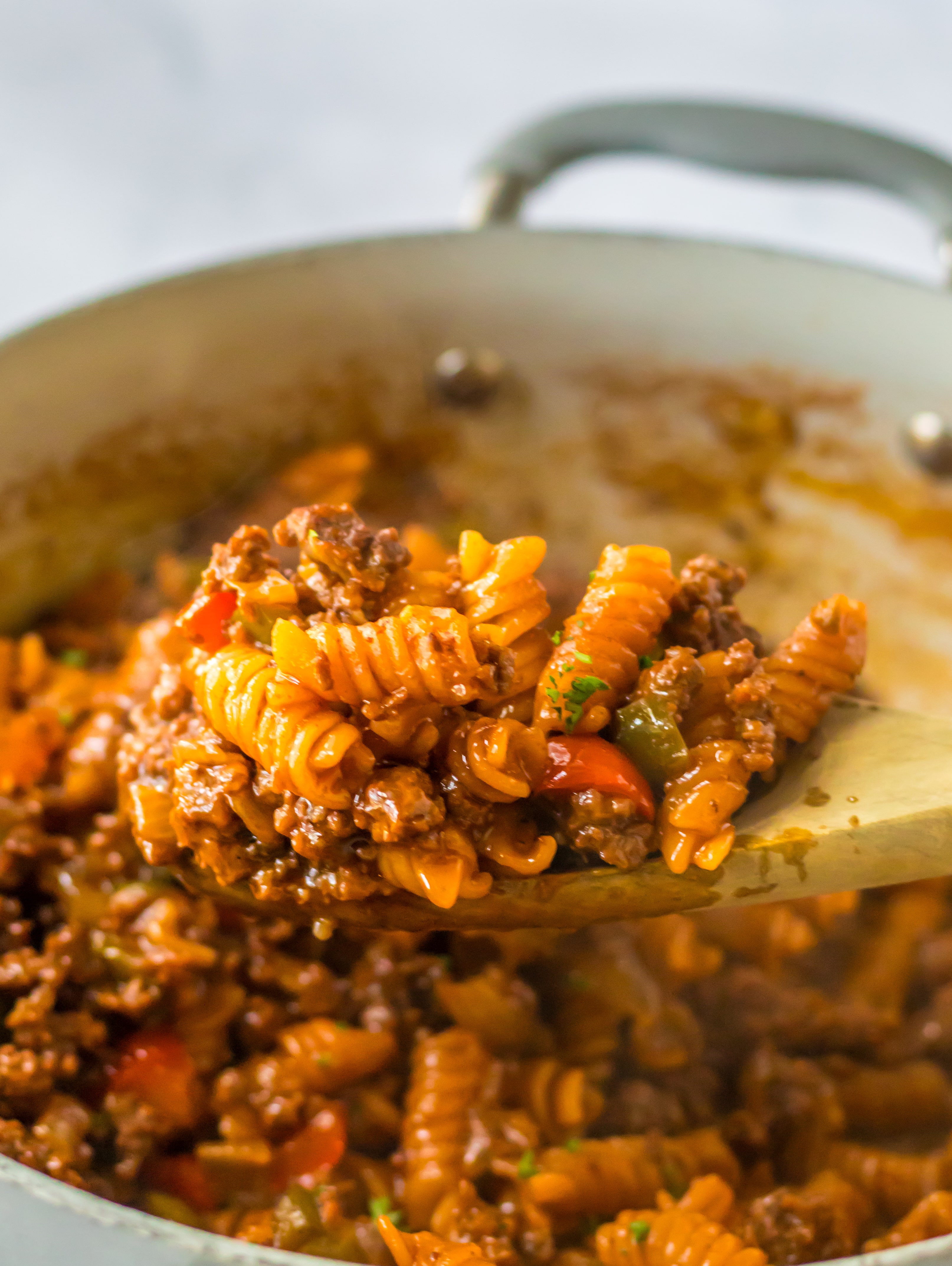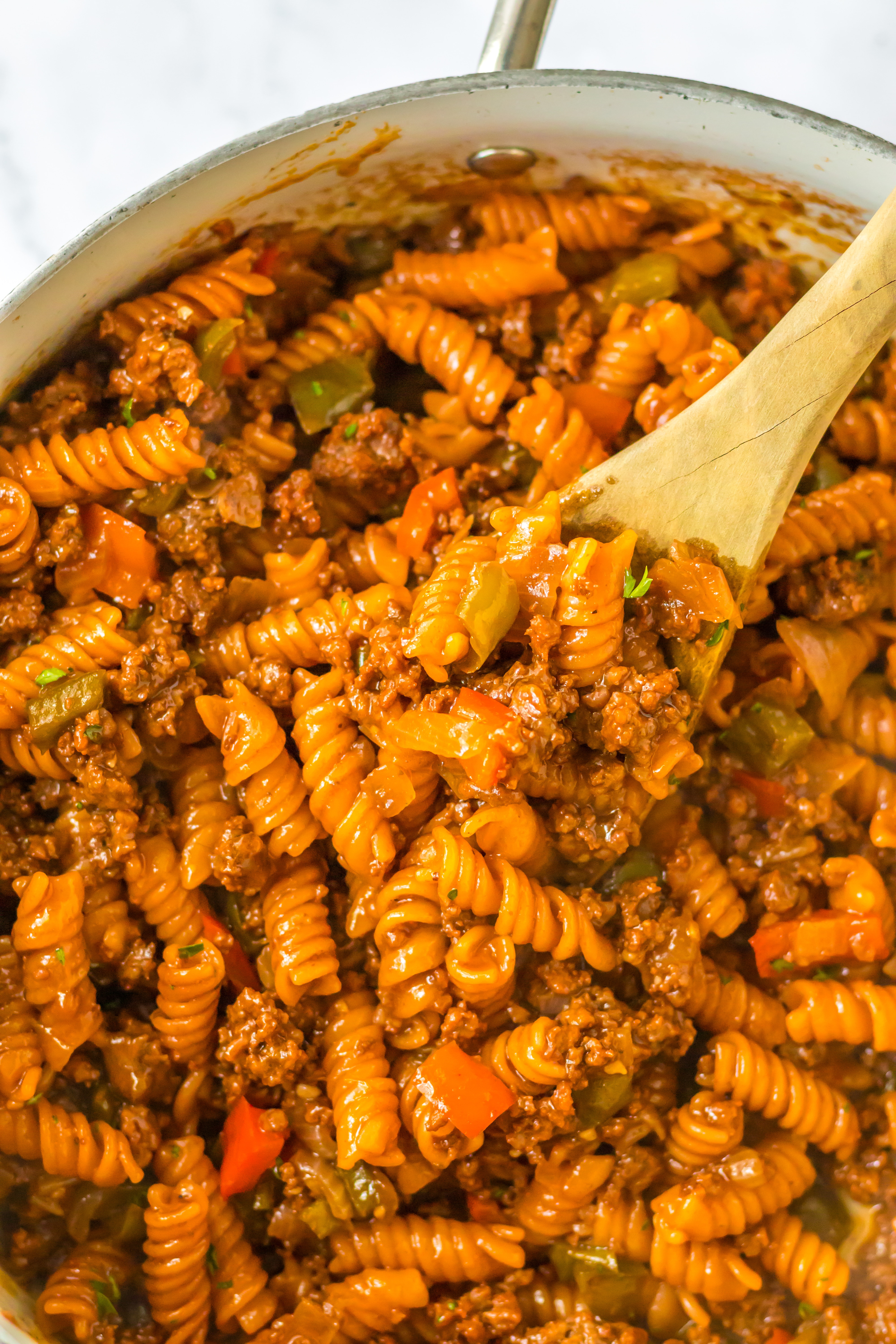 Ground beef, peppers and onions cook up in a flavorful sloppy joe sauce. Rotini noodles cook right in the same pot so you only have one dish to clean! This is the ultimate dinner!