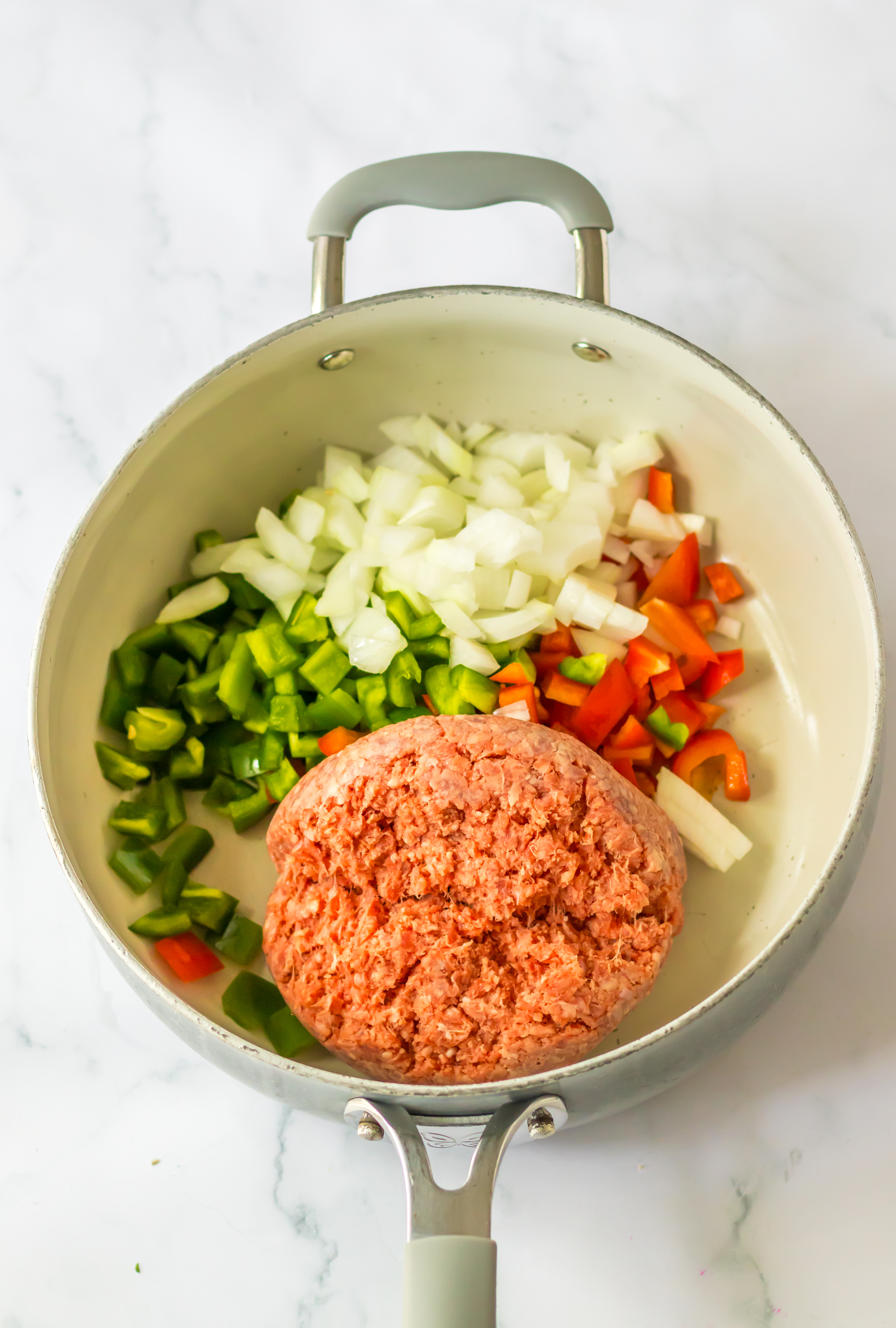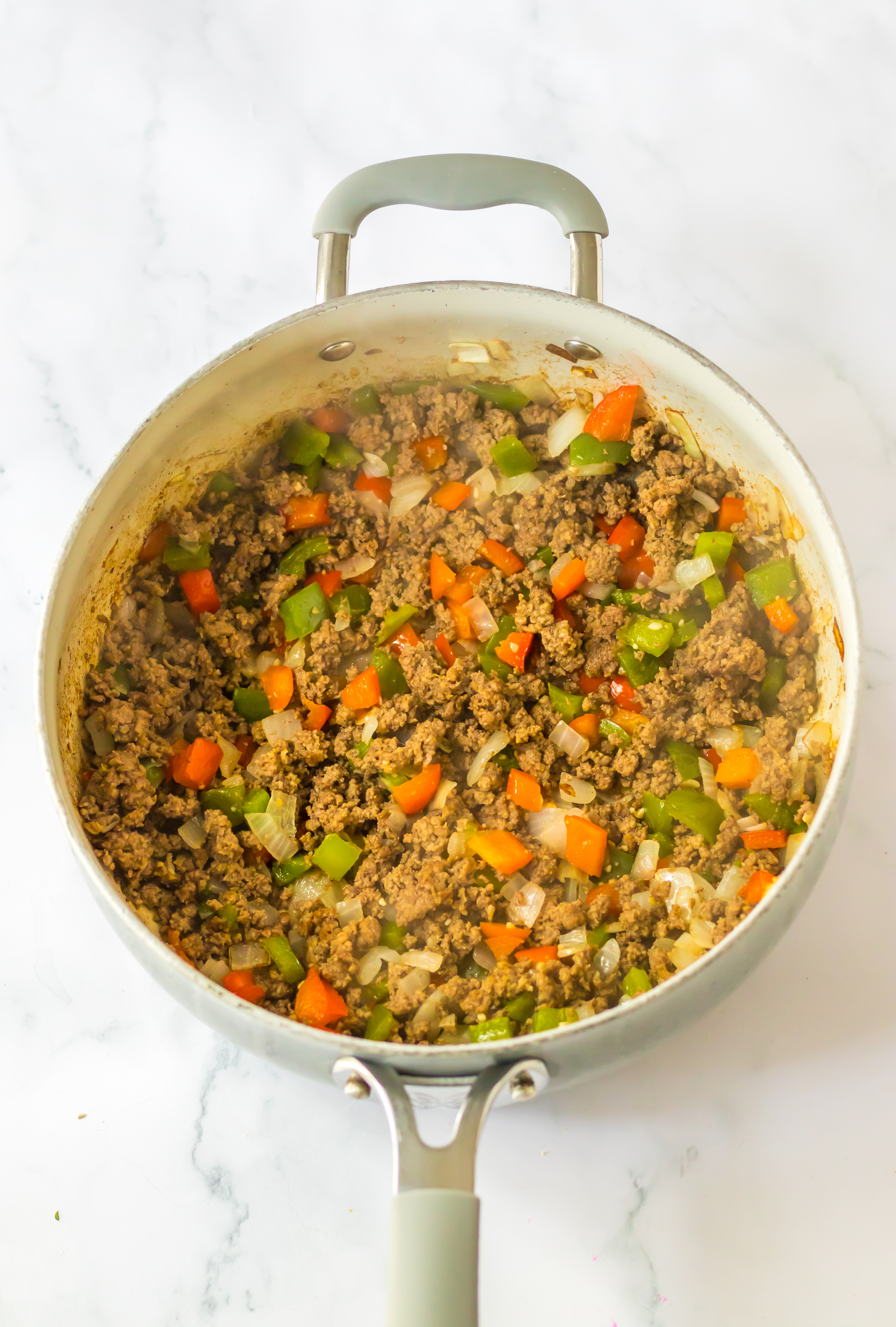- In a large skillet saute your ground beef, peppers, onion and garlic until the beef is cooked through.