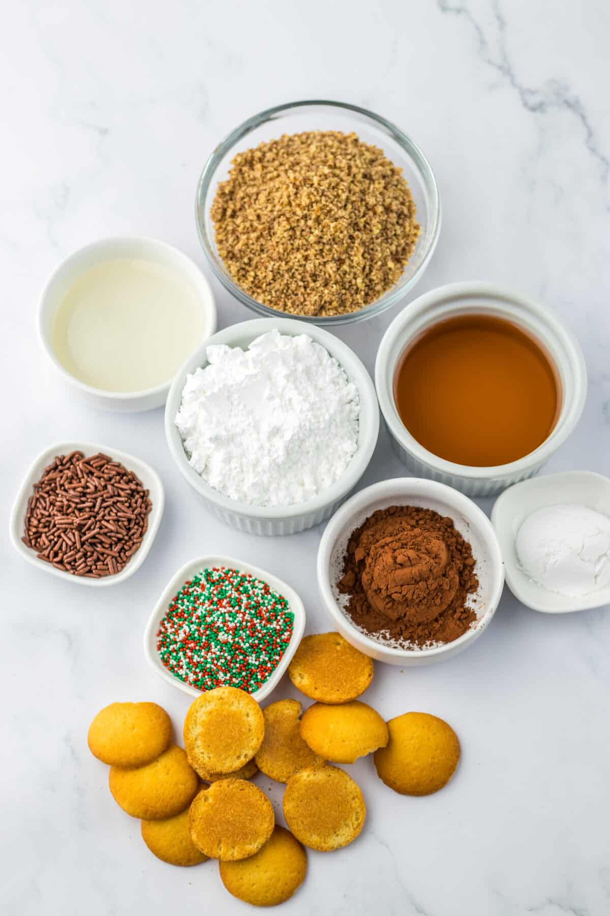 Mix the ingredients: In a large bowl, combine the crushed vanilla wafers, powdered sugar, chopped pecans, cocoa powder, bourbon, and corn syrup.