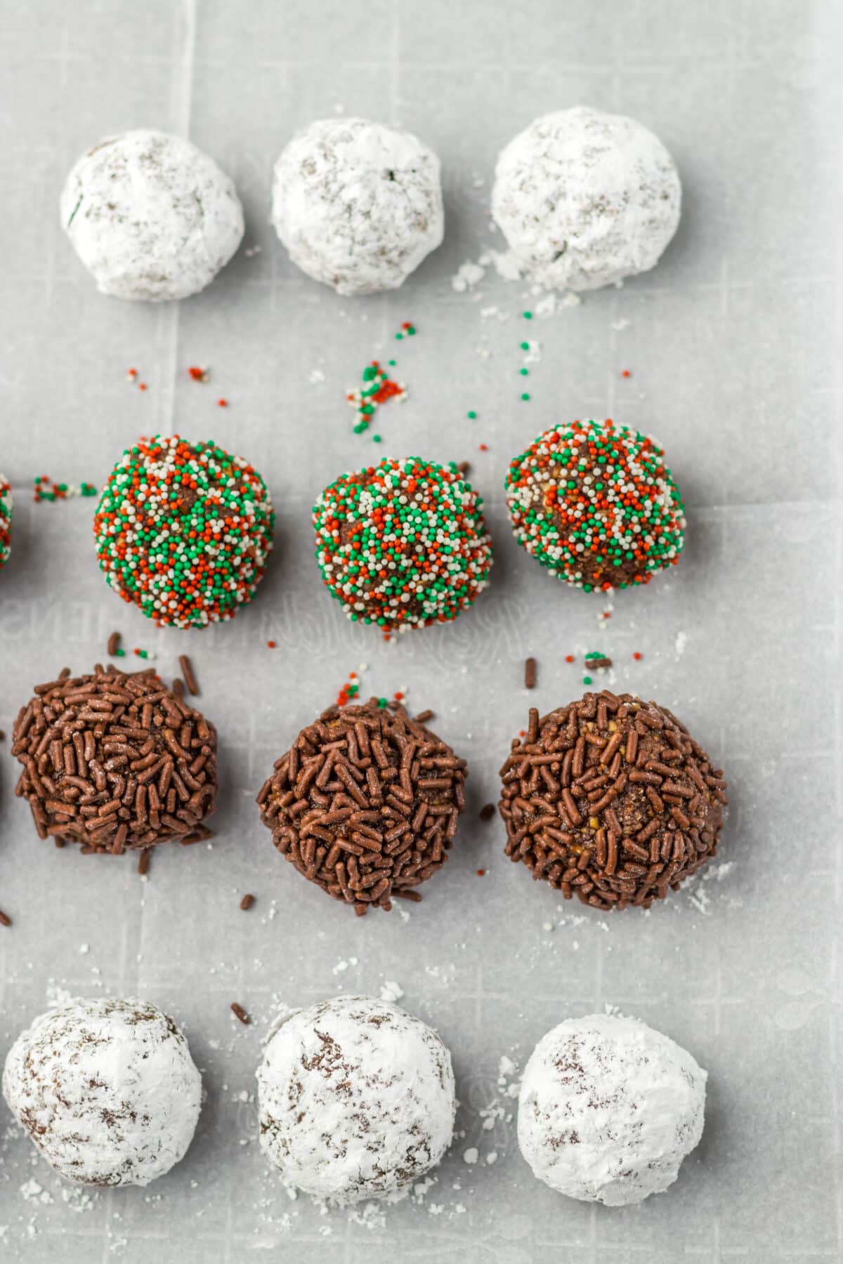 - Roll the balls in either powdered sugar, chocolate jimmies or holiday sprinkles and set on the parchment lined tray.