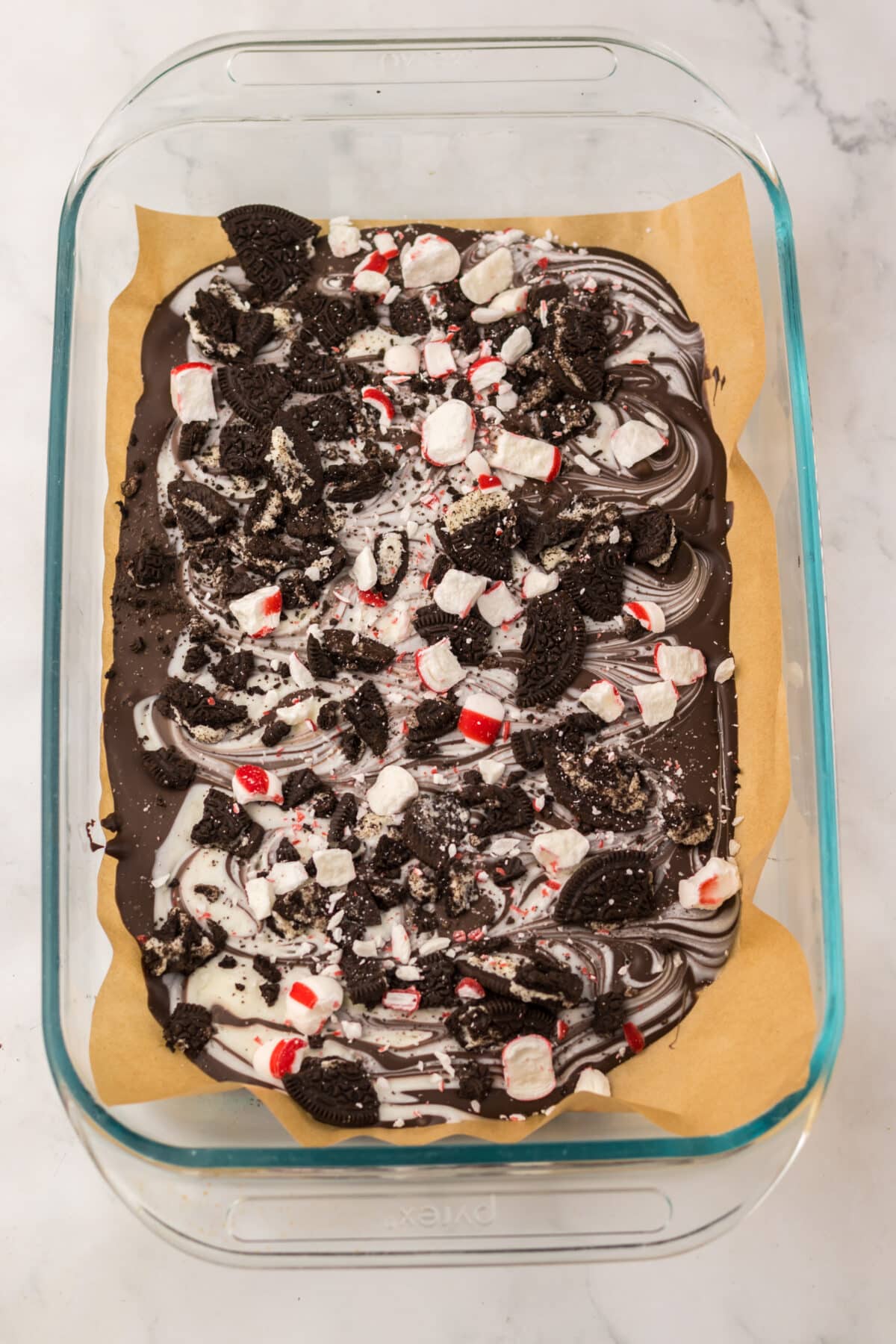 5. Decorate: Sprinkle the Oreos and crushed candy canes evenly over the top. Gently press them into the chocolate so they stick.