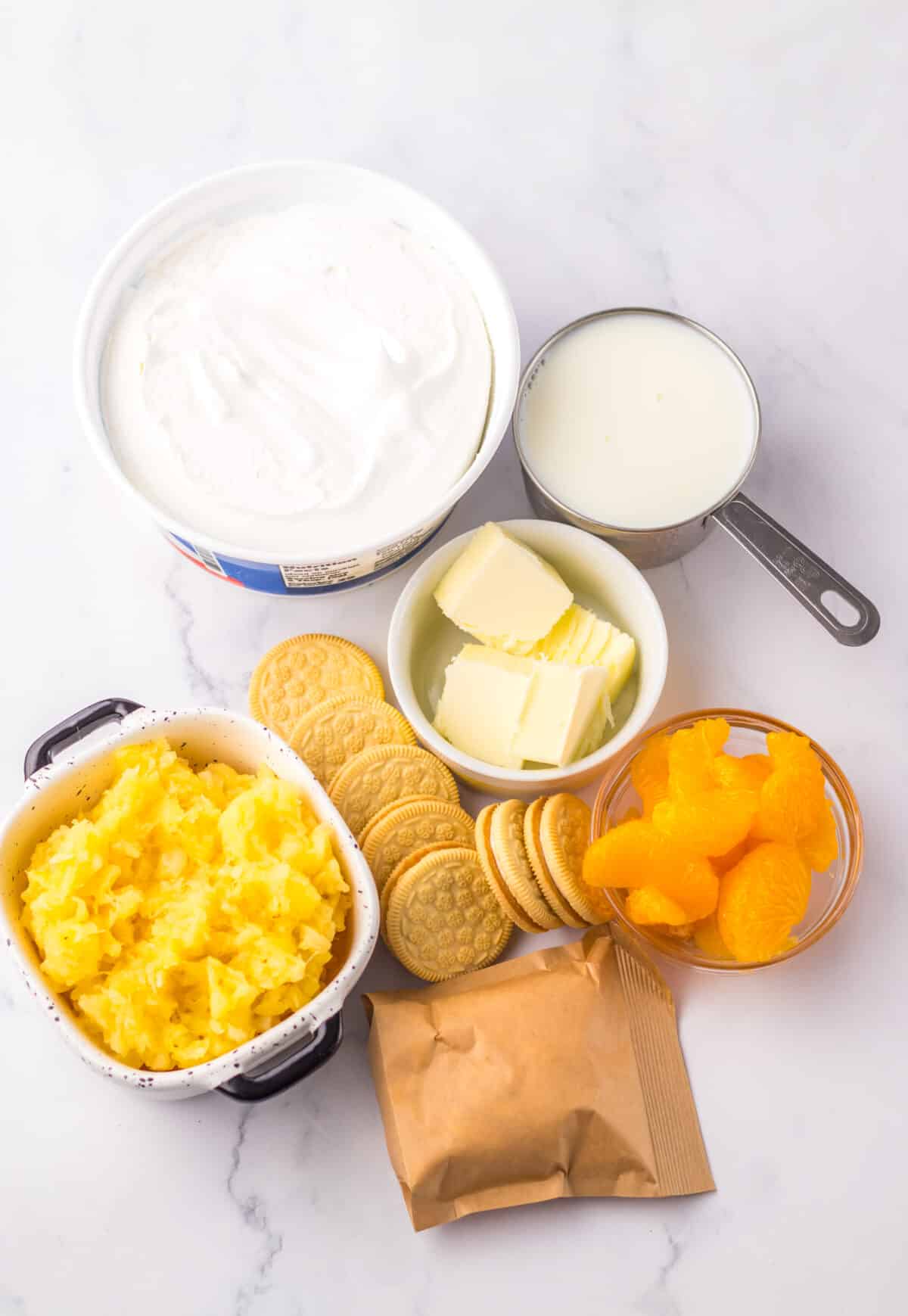 The crust is made from crushed vanilla sandwich cookies, which gives it a sweet, buttery base that pairs perfectly with the fruity filling. Then the filling comes together with crushed pineapple, mandarin oranges, vanilla pudding, and whipped topping. It’s creamy, fluffy, and full of bright citrus flavor.