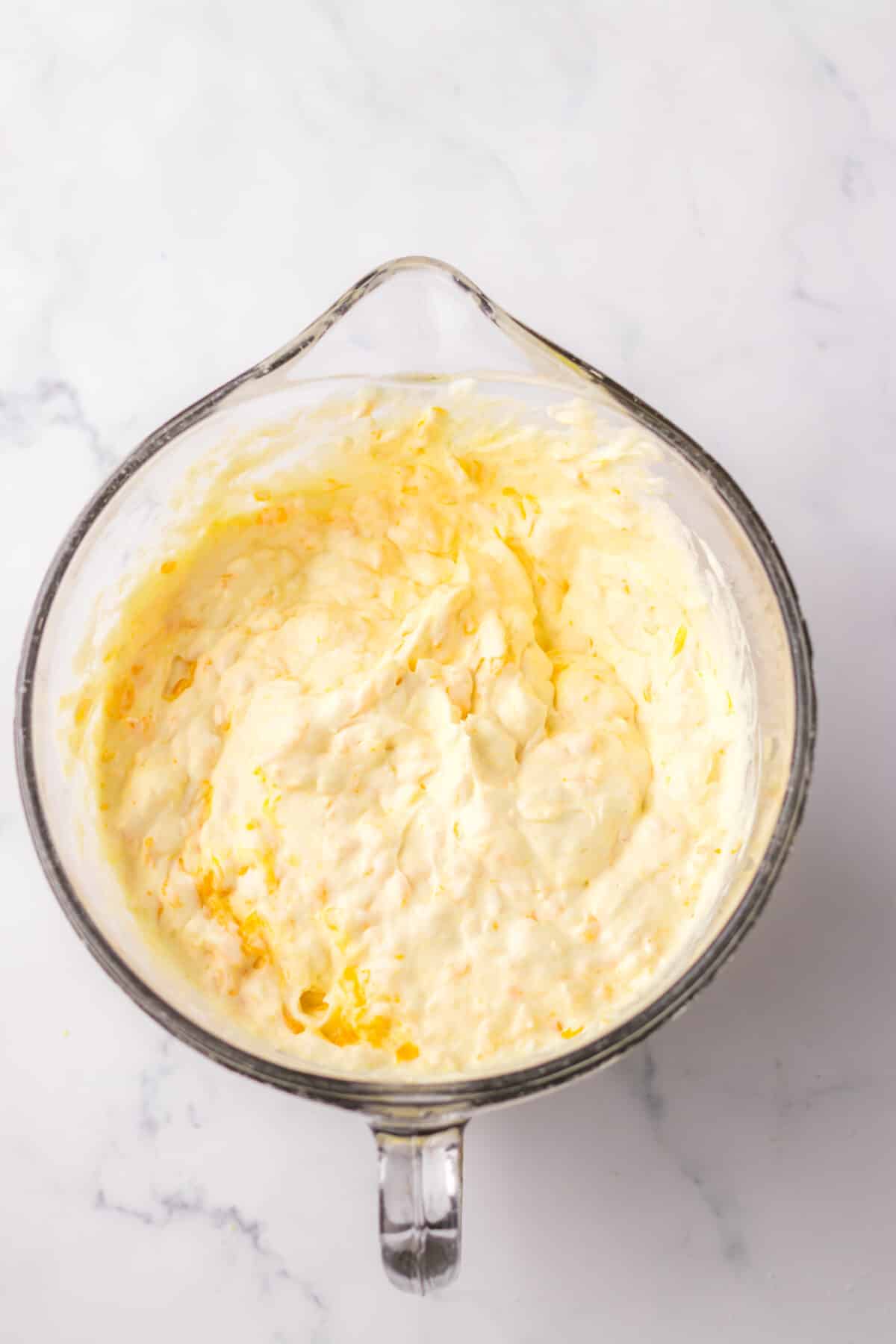 - In a large mixing bowl using and electric mixer combine the drained crushed pineapple and drained mandarin oranges.