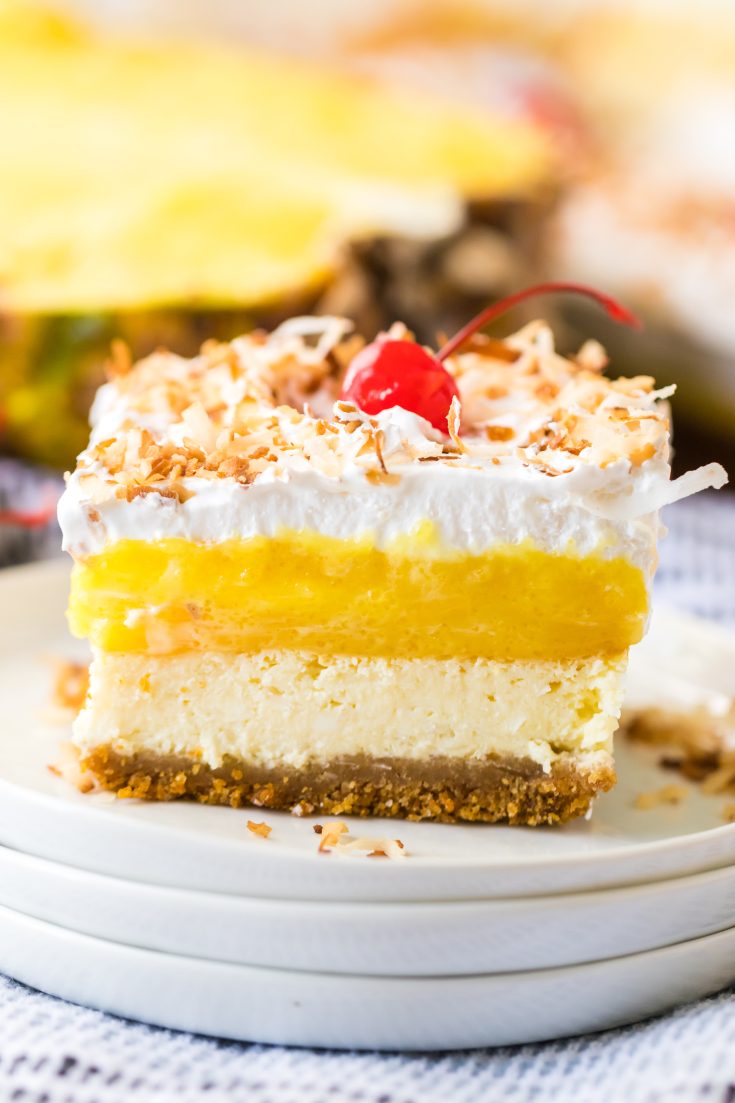 There is nothing I love more an easy dessert that I can just whip together and that everyone will love and these summer cheesecake bars are just that. My favorite part is that this comes together so easy and is always impressive. This is going to be your go to dessert all summer long! This luscious cakes starts with a simple graham cracker crust, a creamy coconut cheesecake layer, a fabulous pineapple layer before getting topped with whipped cream, toasted coconut and of course a cherry! This dessert just screams summer with all the tropical flavors of a piña colada. I like that I can make it the night before and have a stunning dessert for any bbq, cookout or potluck this summer. This is the dessert equivalent of a tropical vacay. I always want to bring the best dessert to every gathering and this one has always impressed. It just looks so gorgeous with it’s layers and everyone always loves anything with a maraschino cherry on top. I love entertaining and summer cookout and bbqs and this is one dessert that is always requested I bring. These cheesecake bars taste like little bites of summer and are an easy to bake dessert. One bite of these and you will be transported to a tropical vacation. I promise these Piña Colada Cheesecake Bars will be your new go-to dessert all summer!
