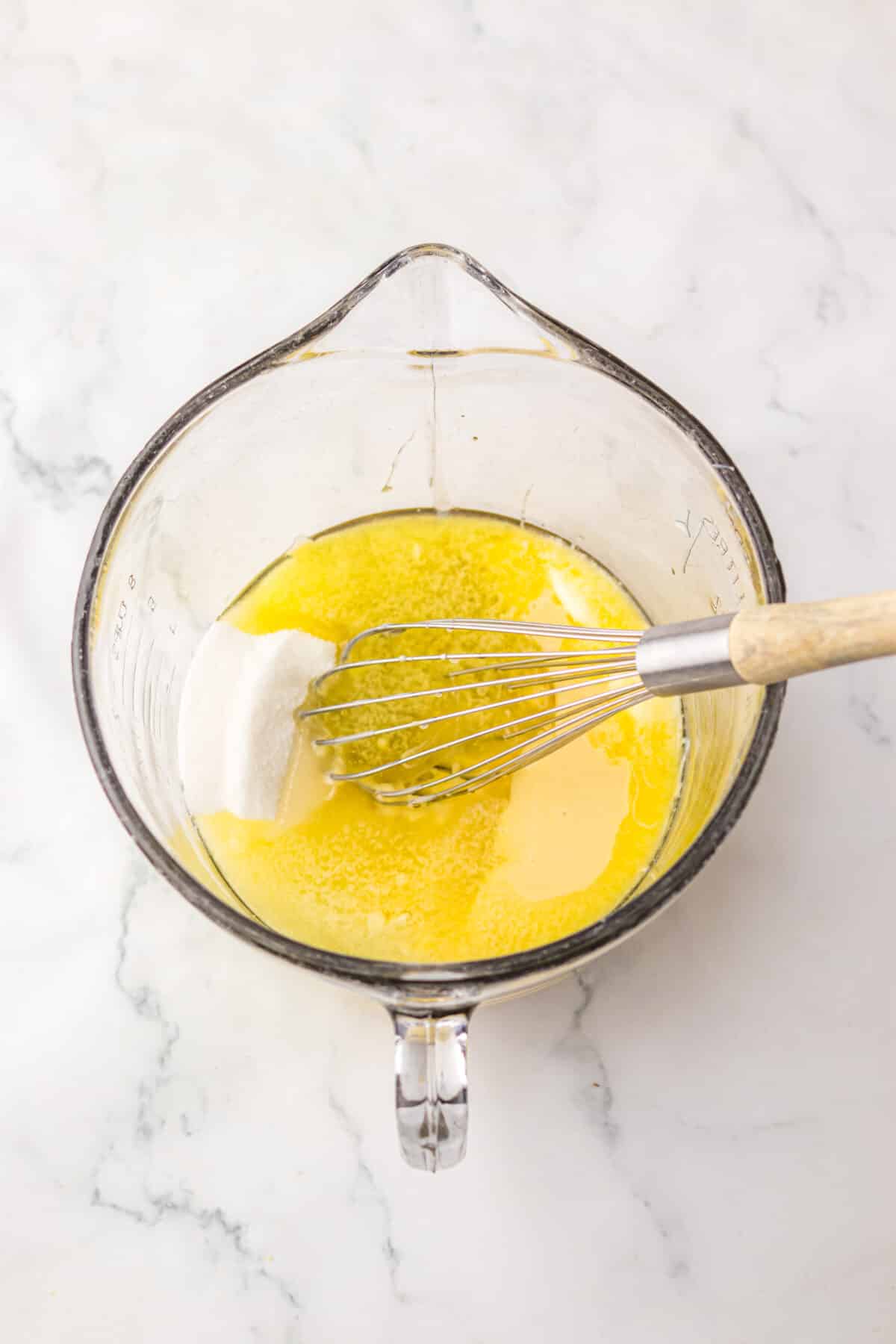 Mix in sugars & syrup – Whisk in corn syrup, granulated sugar, brown sugar, and sweetened condensed milk.