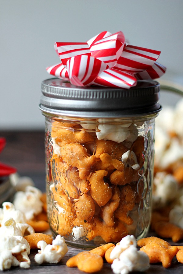 Now like I said this makes a perfect party snack, there isn’t anyone that is going to turn down the fabulous combination of those seasoned cheesy crackers and fluffy popcorn! But this is just fabulous in a rustic little jar topped with a bow.