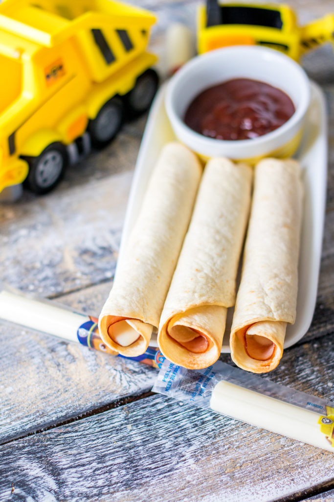 Rubble Roll Ups are a great snack or lunch for kids! String Cheese and Turkey baked to melty perfection perfect for dipping!