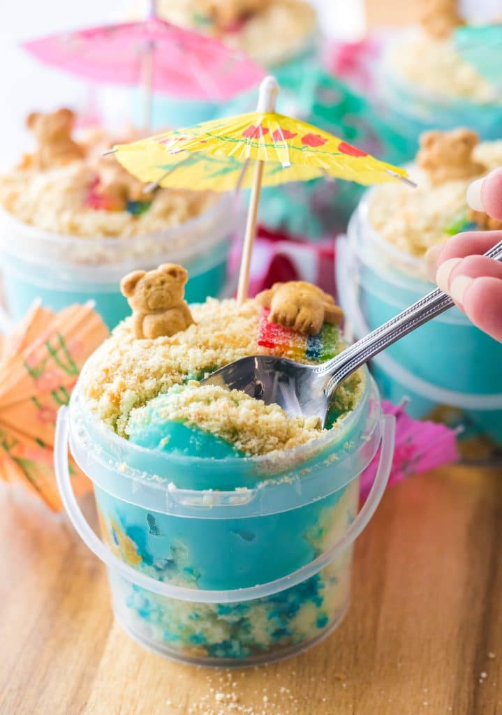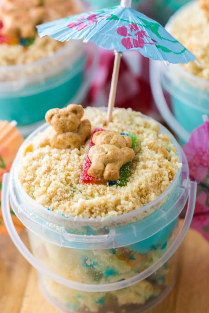 These Sand Bucket Desserts are the perfect summer dessert! Layers of white cake with blue sprinkles, blue colored cheesecake pudding and a topping of crushed cookies for sand. These are then decorated like a little beach scene and are so