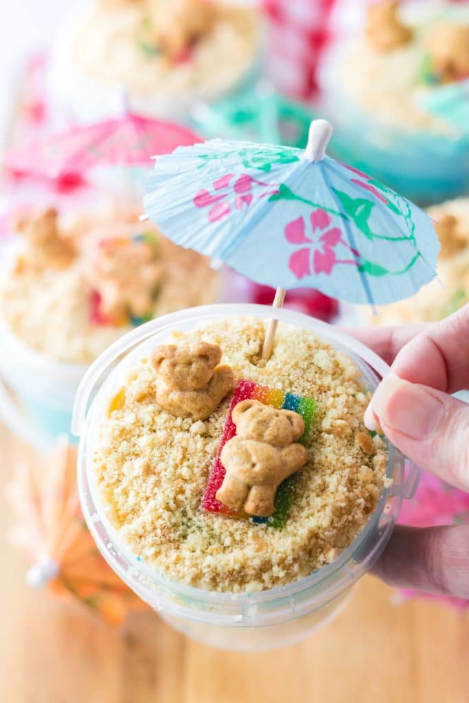 Not only are these Sand Bucket Desserts a crowd-pleaser, but they are also easy to make and customizable. You can use your favorite cake mix and pudding flavor, and get the kids involved in decorating with teddy grahams, paper umbrellas, and rainbow stripe candy. Plus, they can be made ahead of time and stored in the fridge, perfect for those busy summer days when the kids need a quick and tasty snack that is also a fun summer treat.