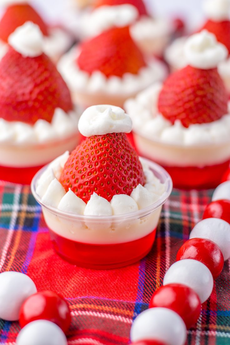 These jolly little shots start with red jello, a creamy white jello layer, a strawberry hat with buttercream. So easy!