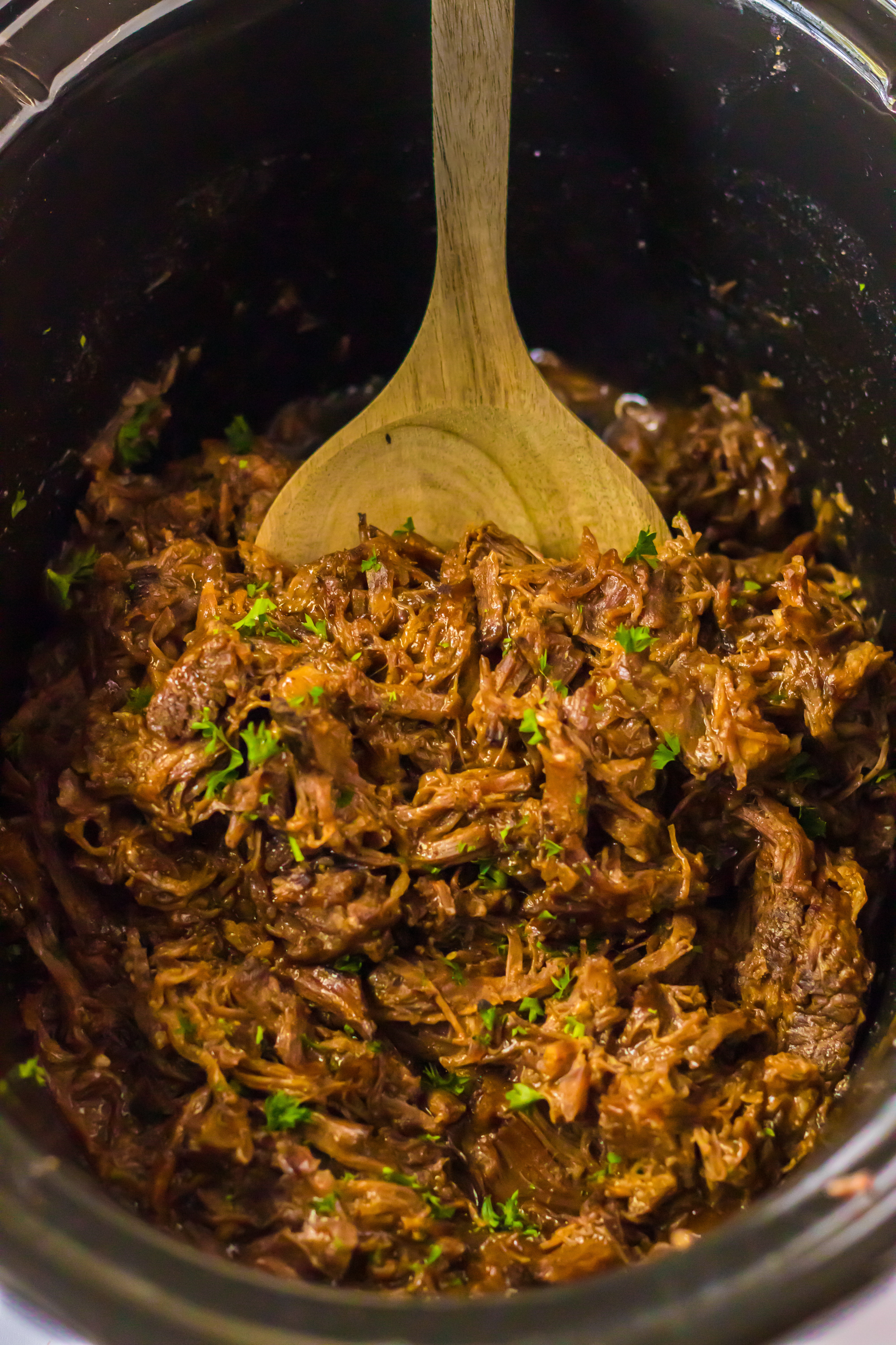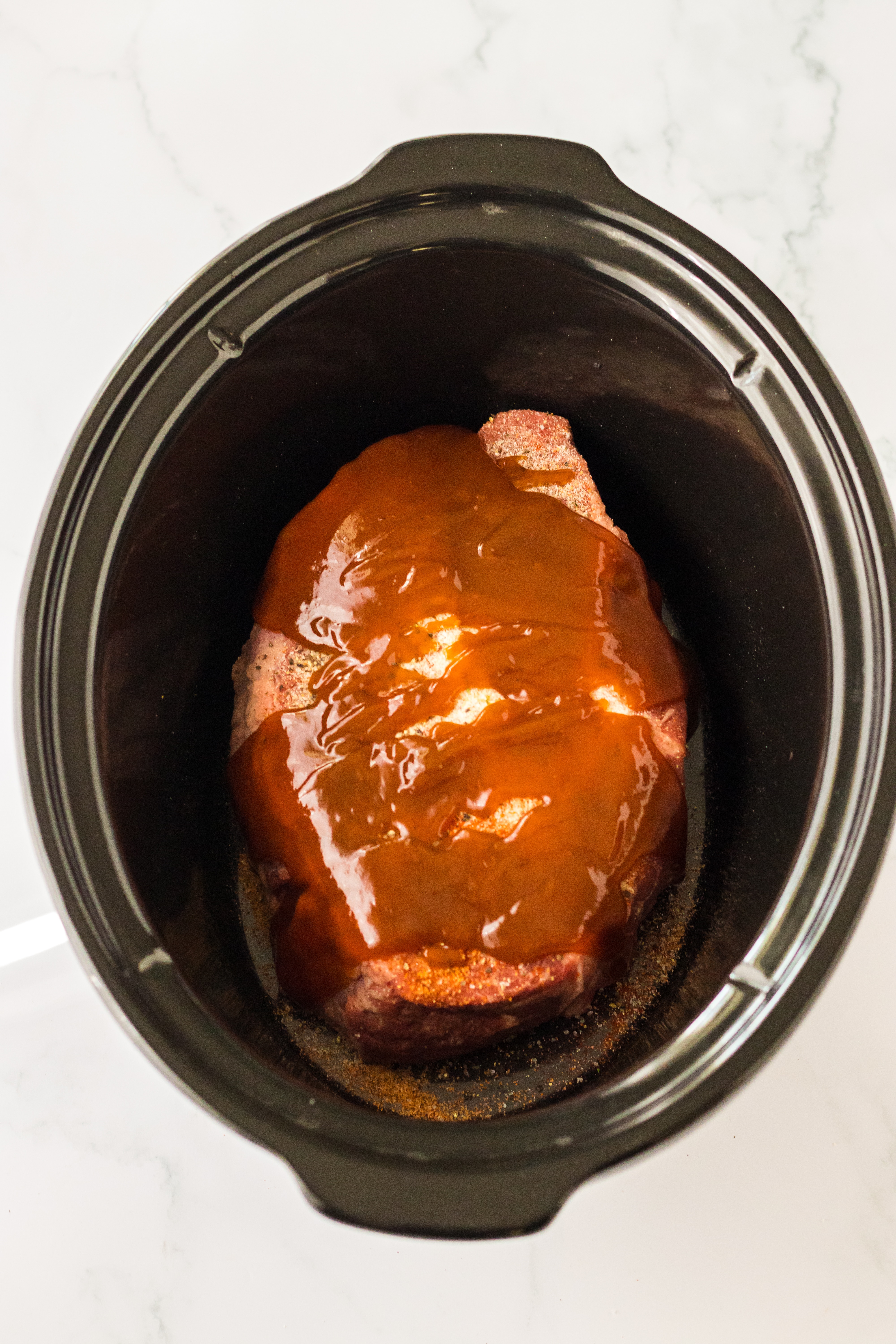 - Shred the meat and add the remaining 1 cup of bbq sauce to the slow cooker, stir to combine.