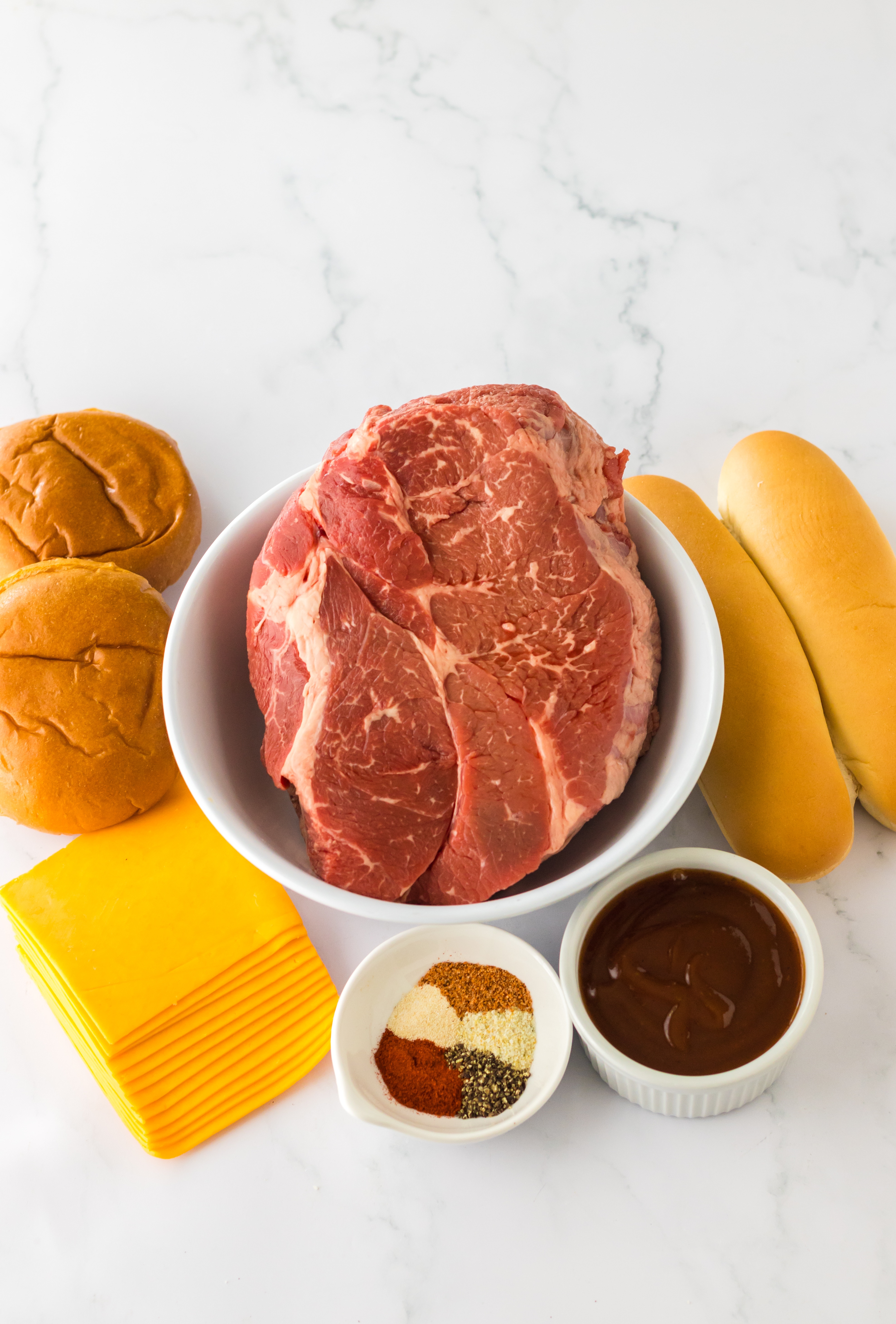 This meat just falls apart it is so tender. It slow cooks all day to perfection in seasonings and bbq sauce. Then it gets piled high on soft buns with melty cheese. These are the best bbq sandwiches!