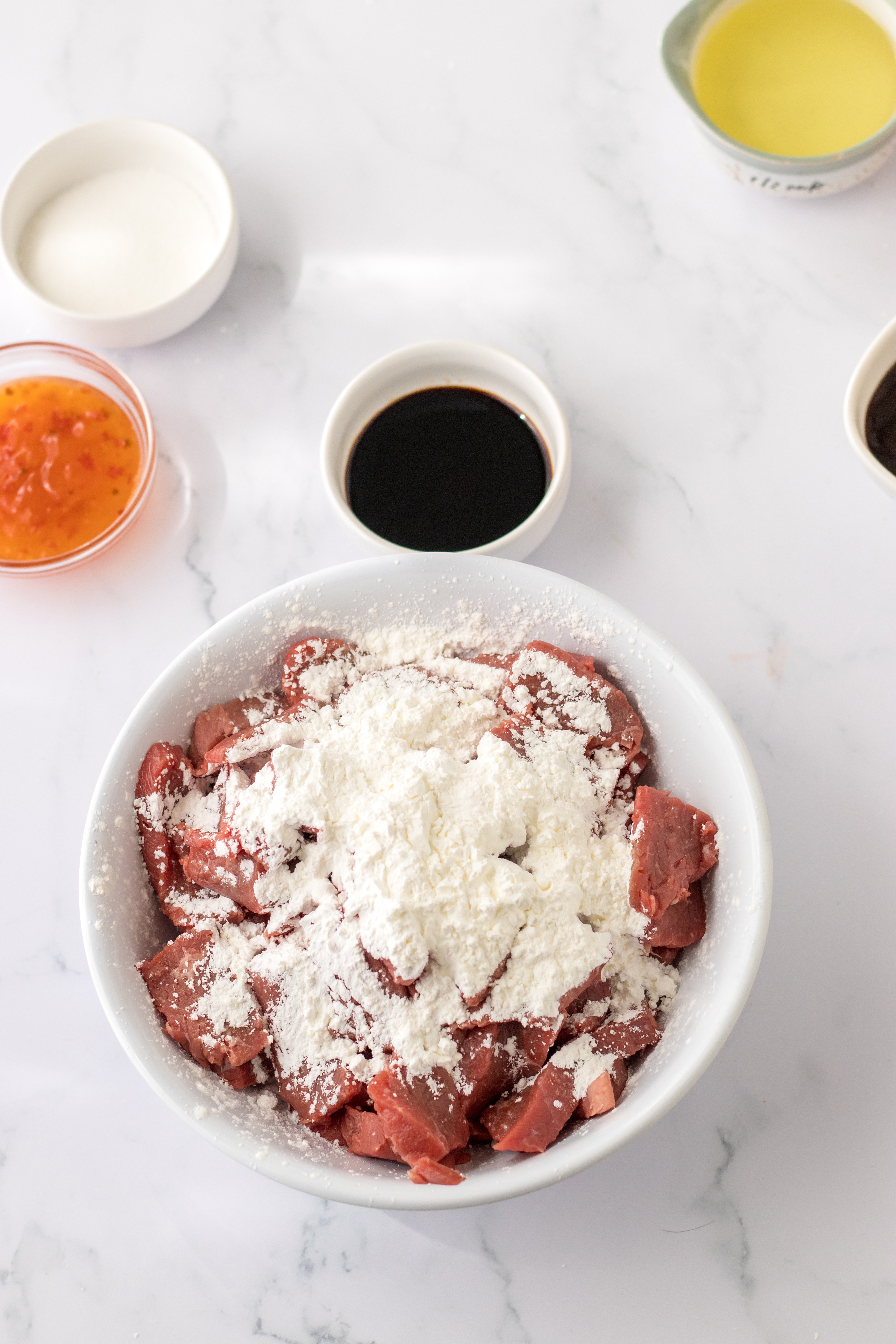 - Make sure the meat is just dusted with the cornstarch, you don’t want it too heavy.