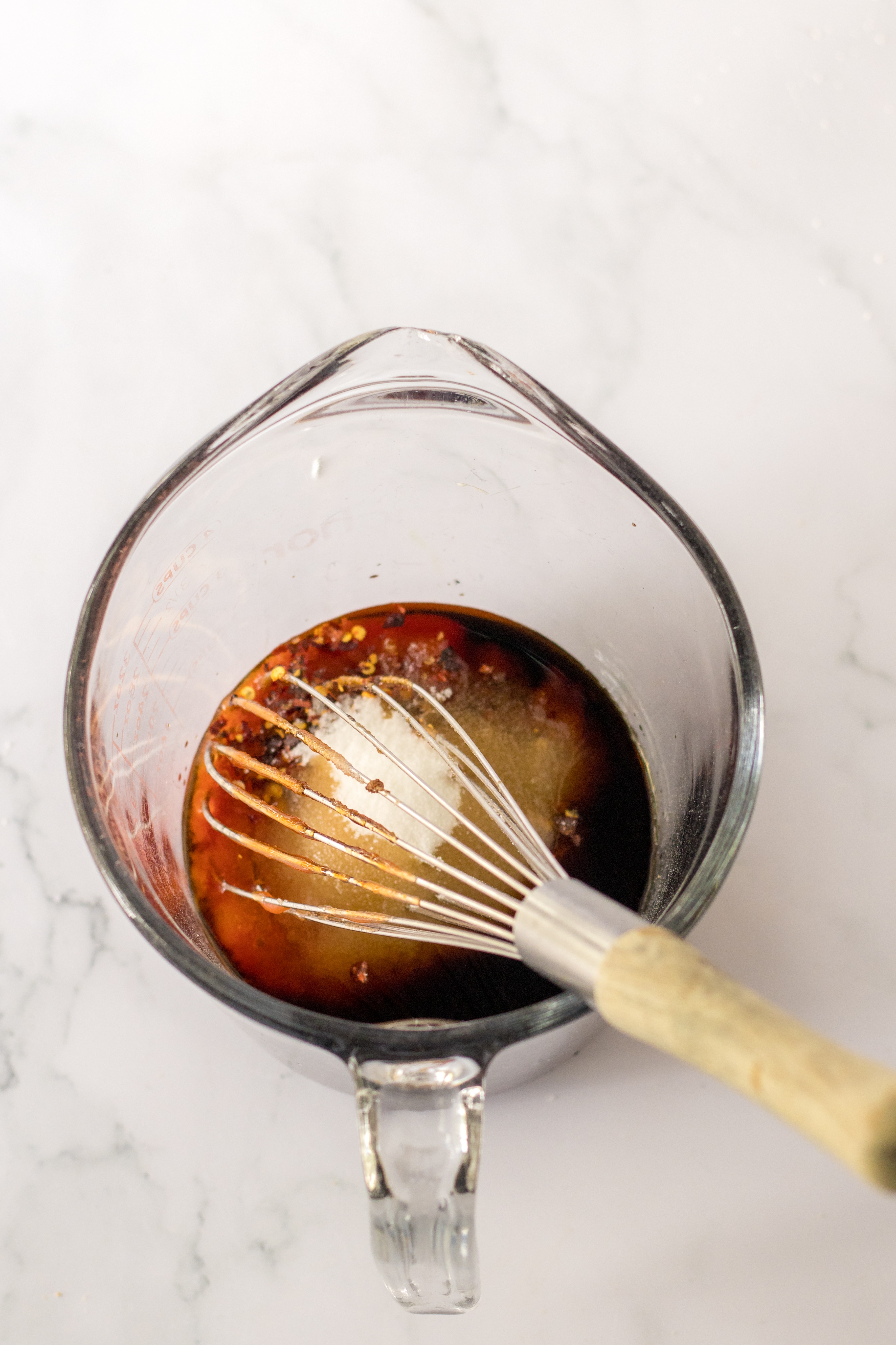- To a small bowl combine the sugar, ketchup, hoisin, soy sauce, sweet chili sauce, vinegar, water and red pepper flakes.