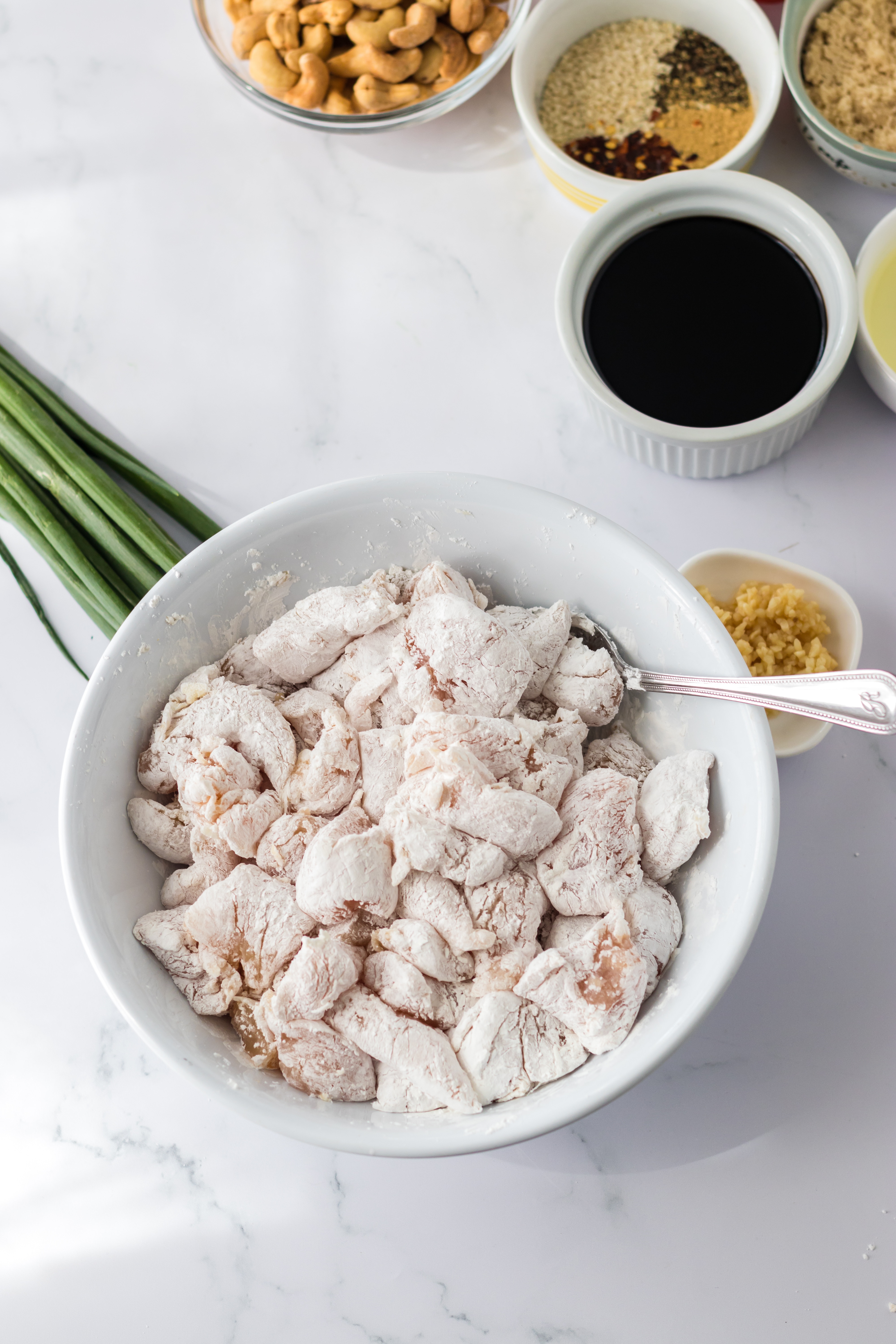 1. Cut the chicken into bite-sized pieces and toss with cornstarch.