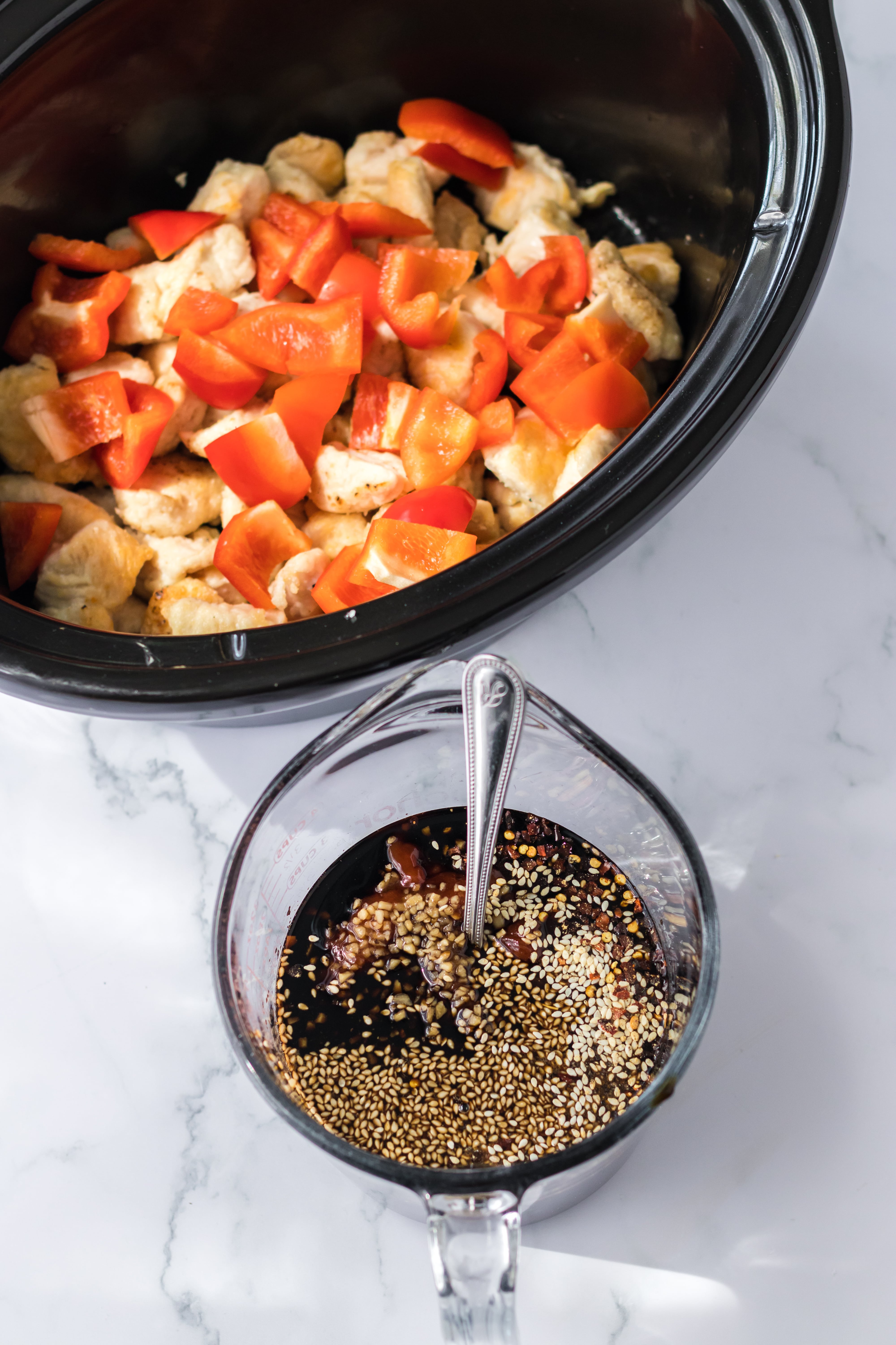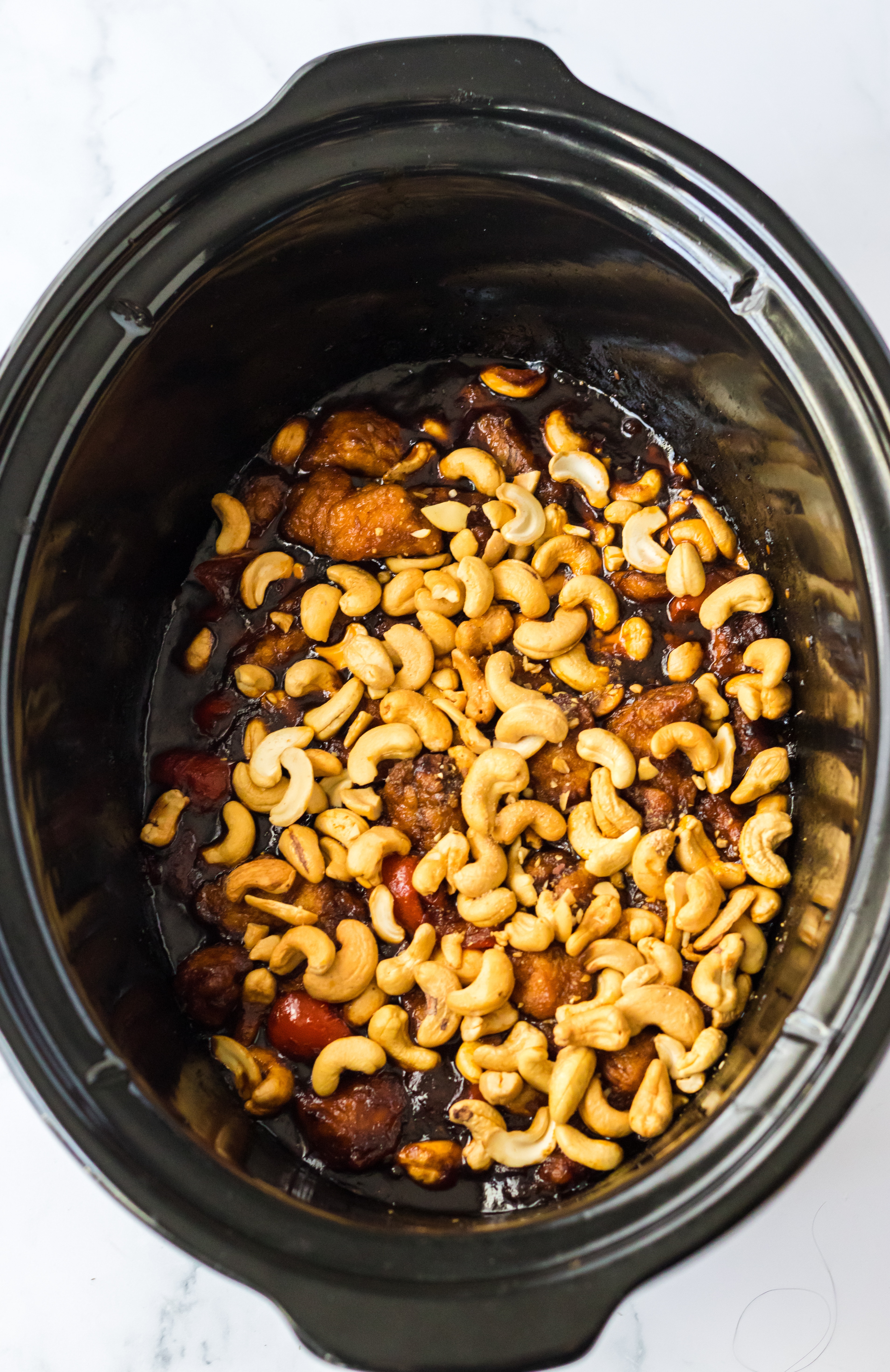 A quick fry in the skillet to get the chicken crispy and then the chicken and sauce goes in the slow cooker with some red bell pepper and cashews and cooks up to perfection!