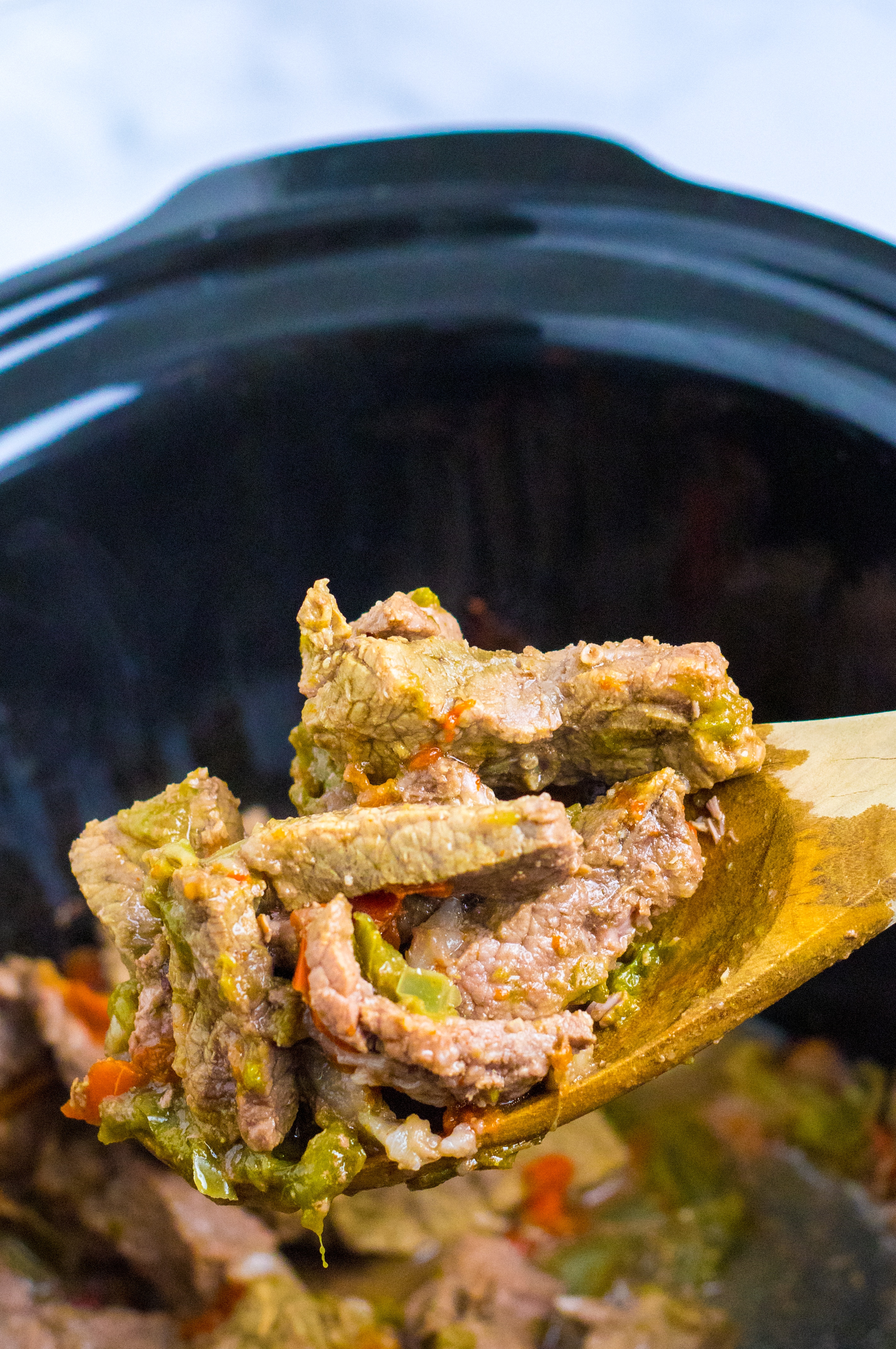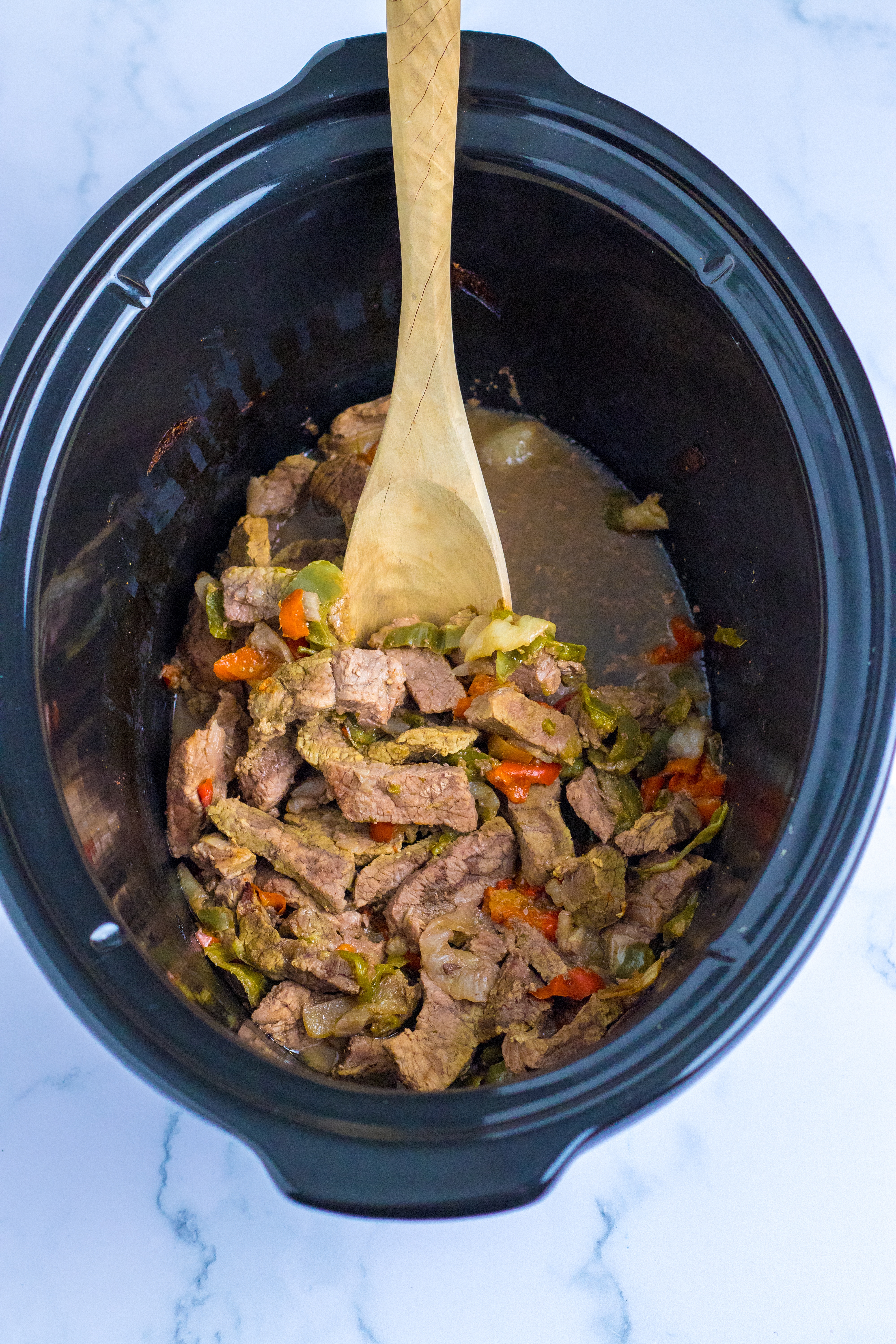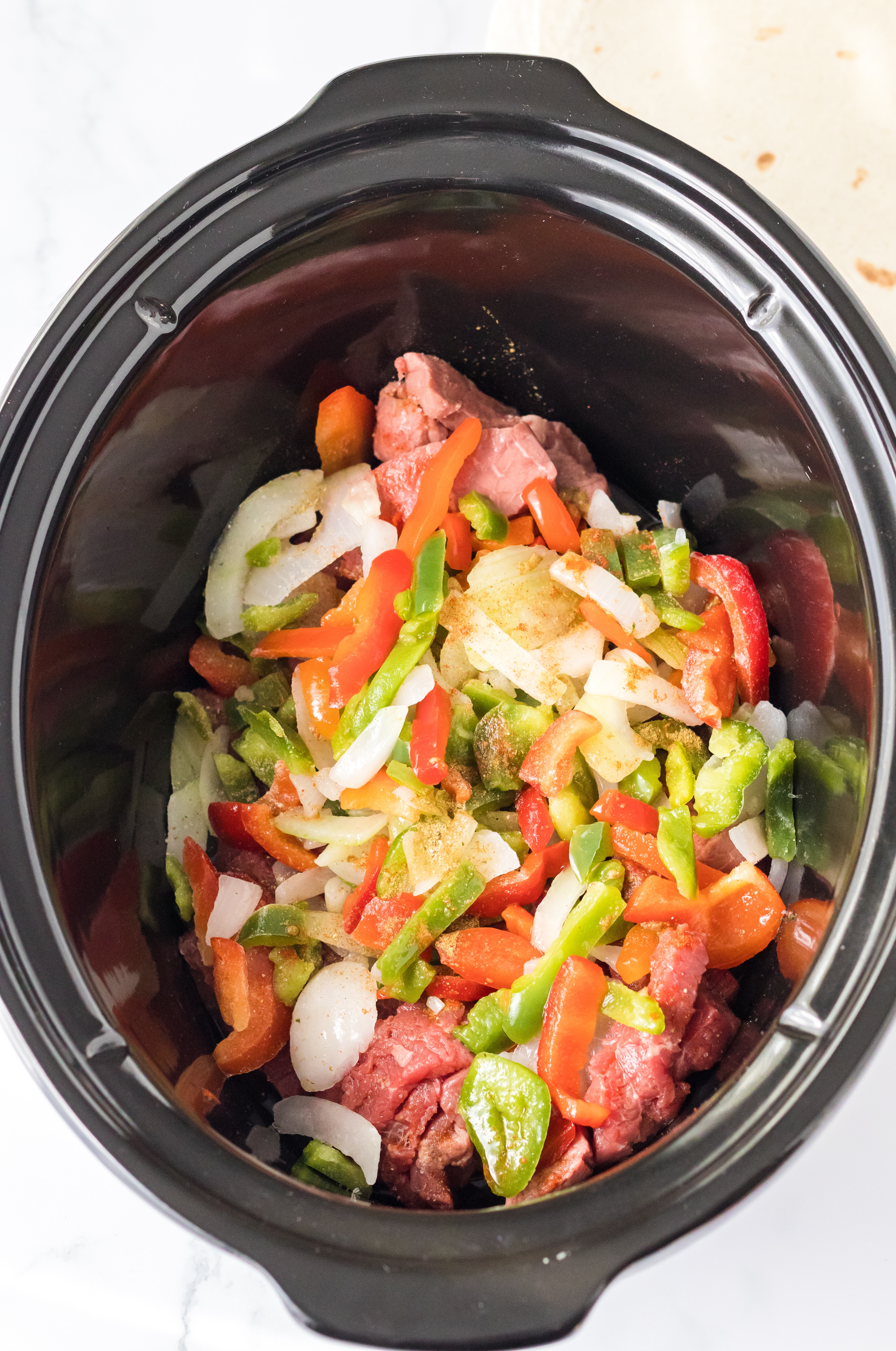 1. In your slow cooker add the meat and peppers and onions.