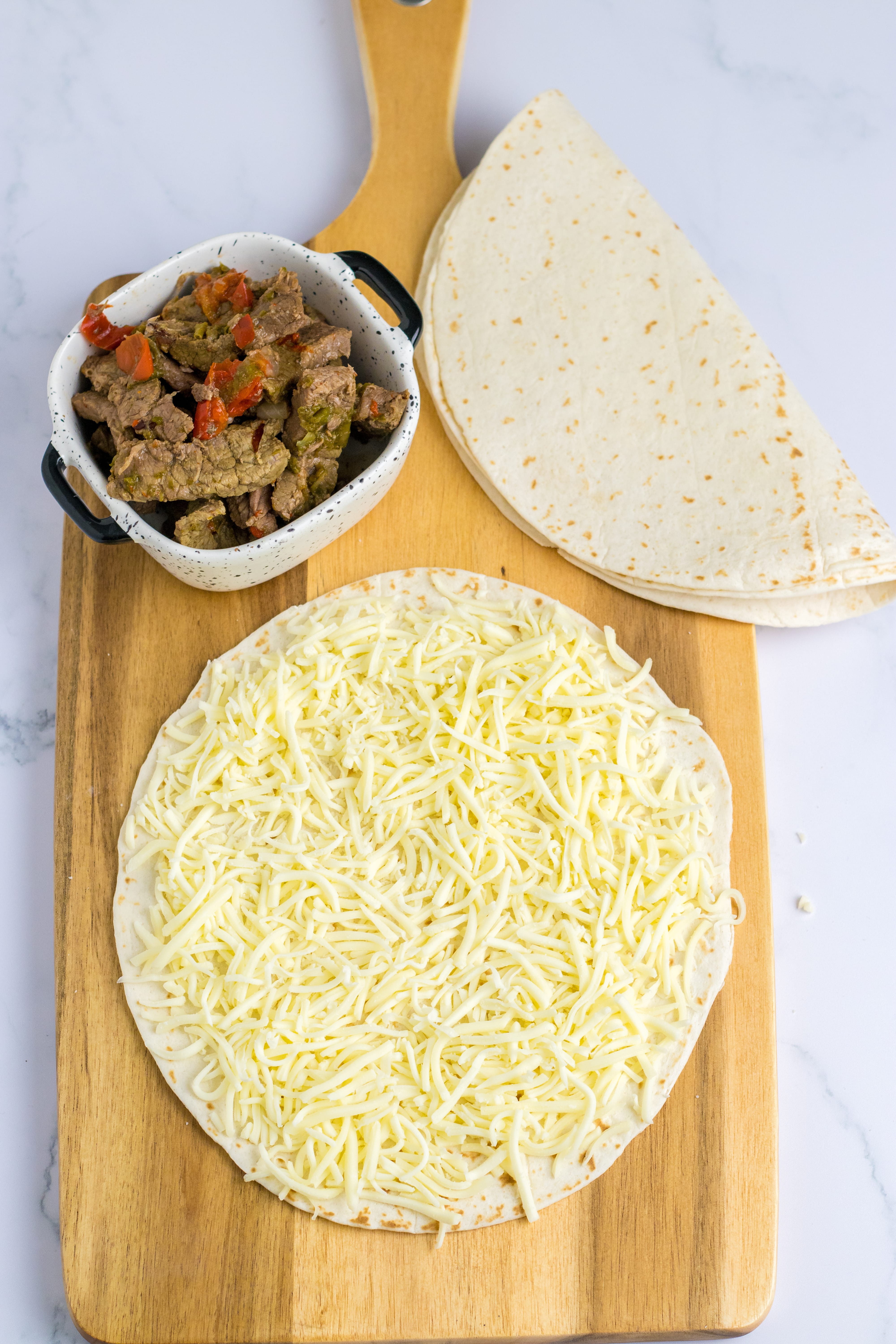 - Drain the juice from the beef and start to assemble your quesadillas.