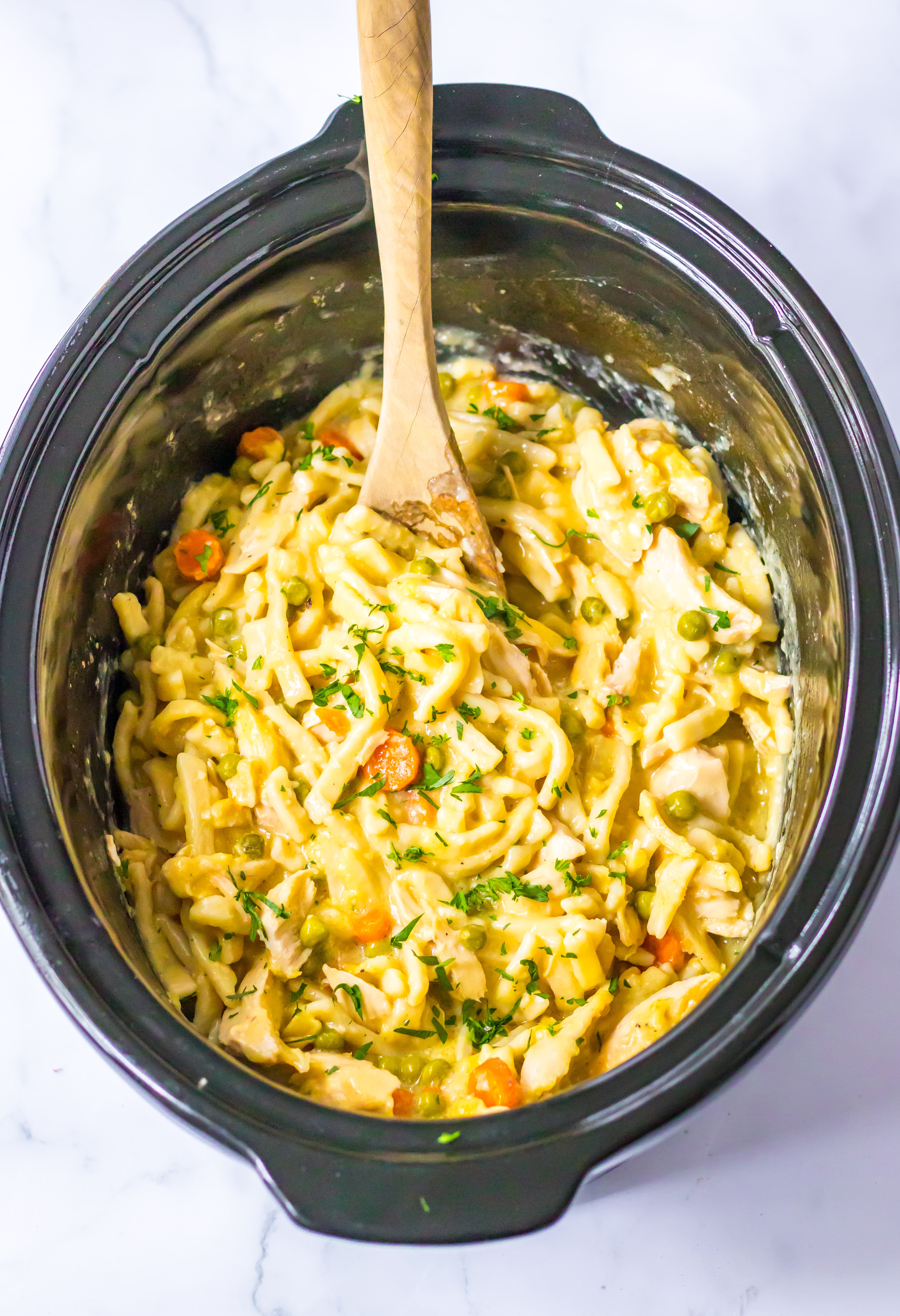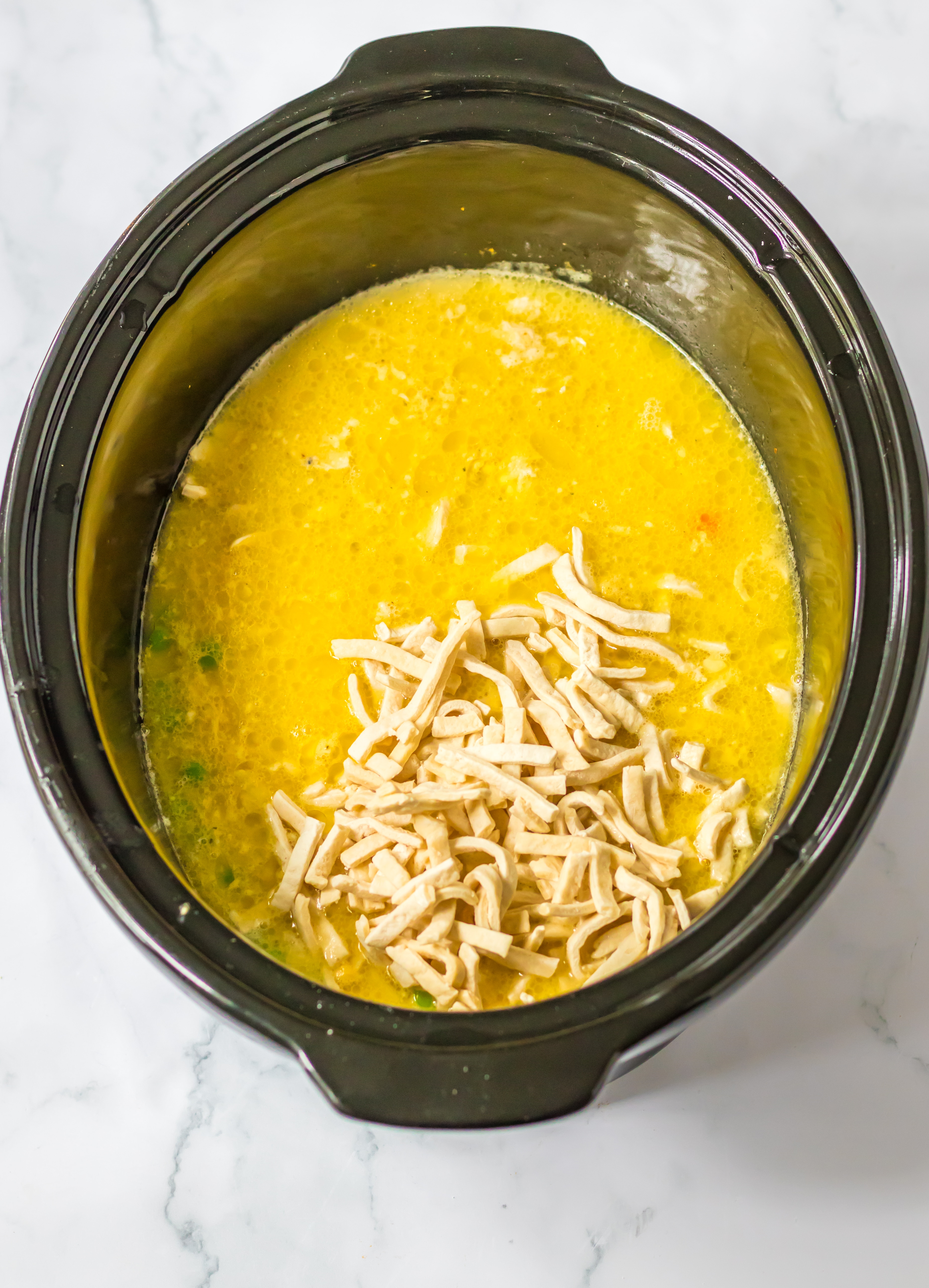 - To the slow cooker add the frozen noodles, shredded chicken and peas.
