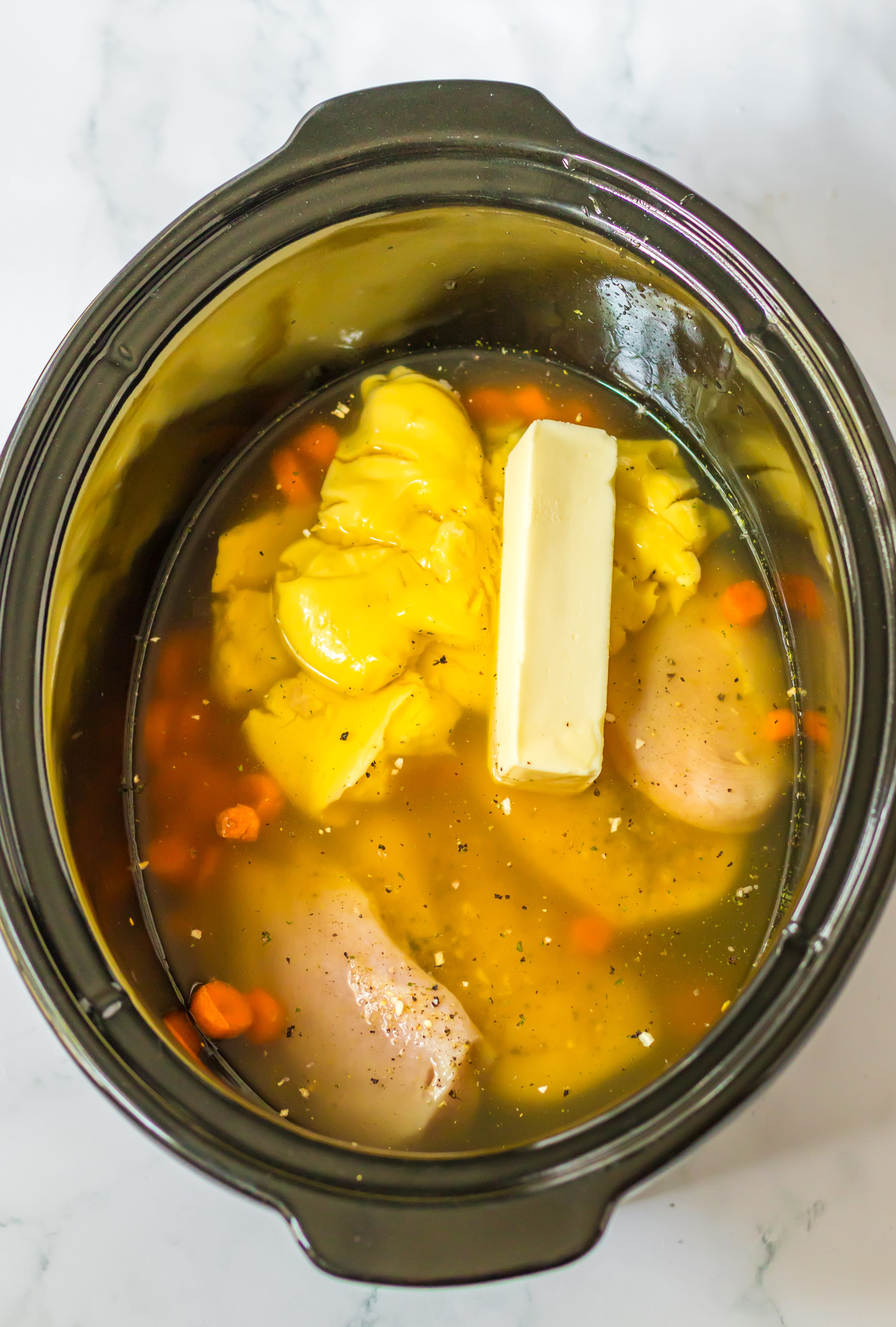 - Into the slow cooker add the chicken stock, cream of chicken soup, sliced carrots and butter.