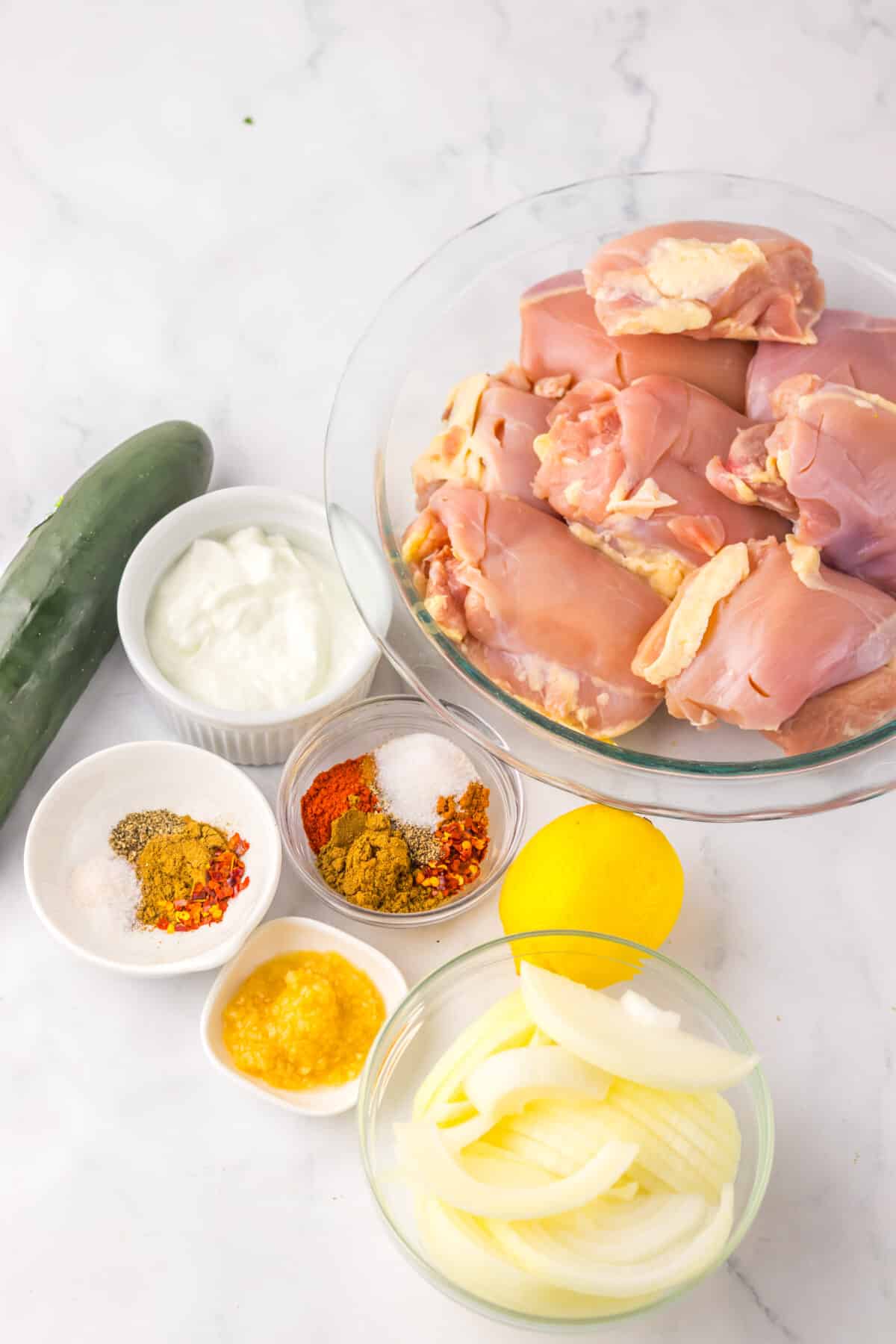 - In a large bowl whisk together the marinade ingredients, ⅓ cup plain Greek yogurt, 2 tablespoons fresh lemon juice, 3 cloves garlic, minced, 2 teaspoons smoked or sweet paprika, 2 teaspoons ground cumin, 1 ½ teaspoons black pepper, 1 teaspoon salt, ½ teaspoon ground turmeric, ½ teaspoon ground cinnamon and 1/2 teaspoon red pepper flakes.