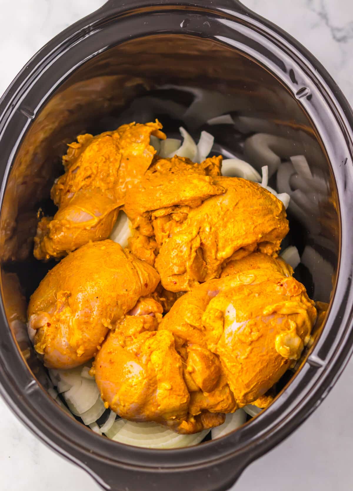 Place the sliced onion in the bottom of your slow cooker. Add the marinated chicken on top. Cover and cook on high for 3–4 hours or low for 4–6 hours, until the chicken is tender and cooked through.Slice and Return: