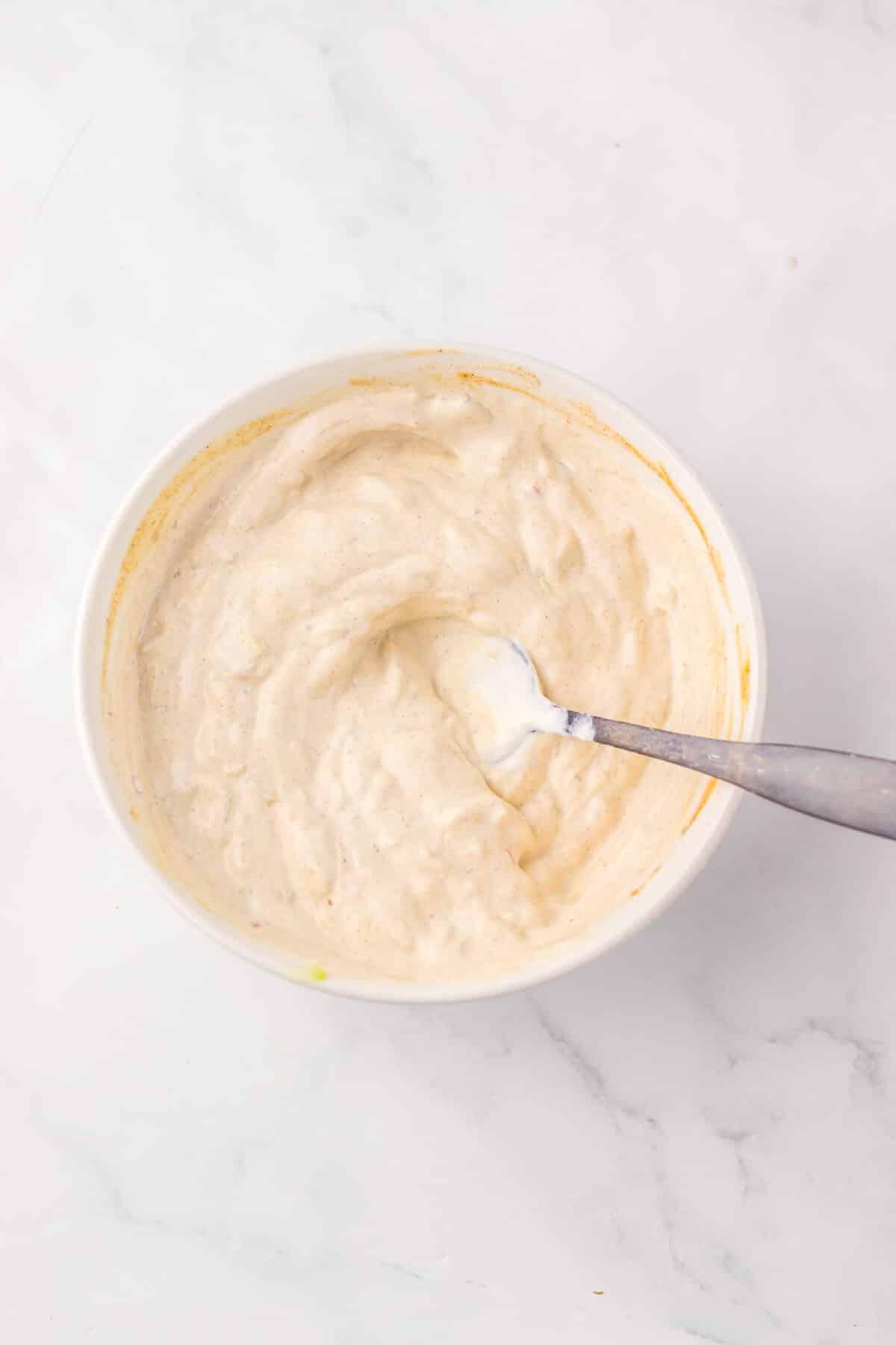 - In a mixing bowl combine the 1 cup plain Greek yogurt, 1 teaspoon minced garlic, 2 tablespoons grated cucumber, 1 teaspoon cumin, 1 tablespoon lemon juice, 1/4 teaspoon salt, 1/4 teaspoon black pepper, ⅛ teaspoon red pepper flake.