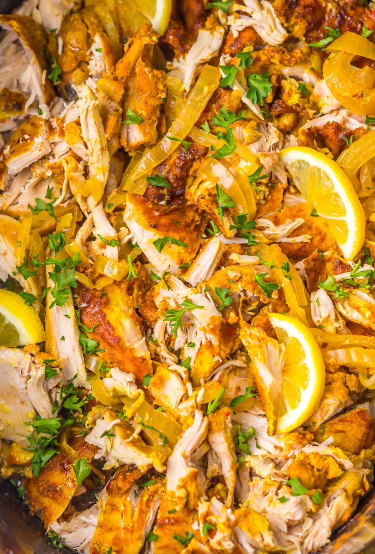 This recipe brings all the flavors of your favorite Mediterranean takeout right to your own table. Juicy, marinated chicken thighs cook low and slow with onions and spices until they’re tender enough to shred with a fork. Then you pile it high on fluffy pita bread, drizzle it with creamy yogurt sauce, and add all your favorite toppings, crisp lettuce, juicy tomatoes, crunchy cucumbers, and thin slices of red onion.