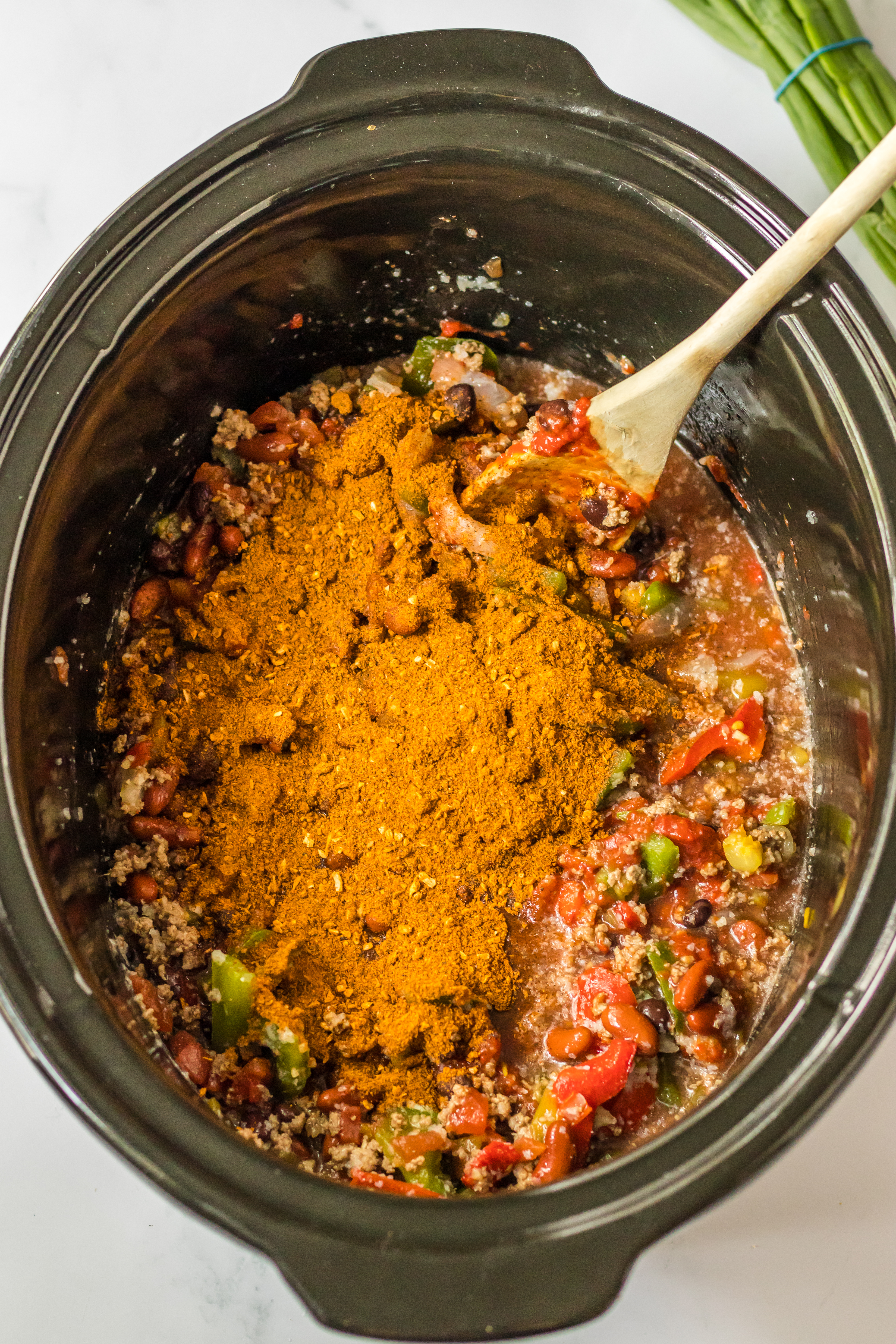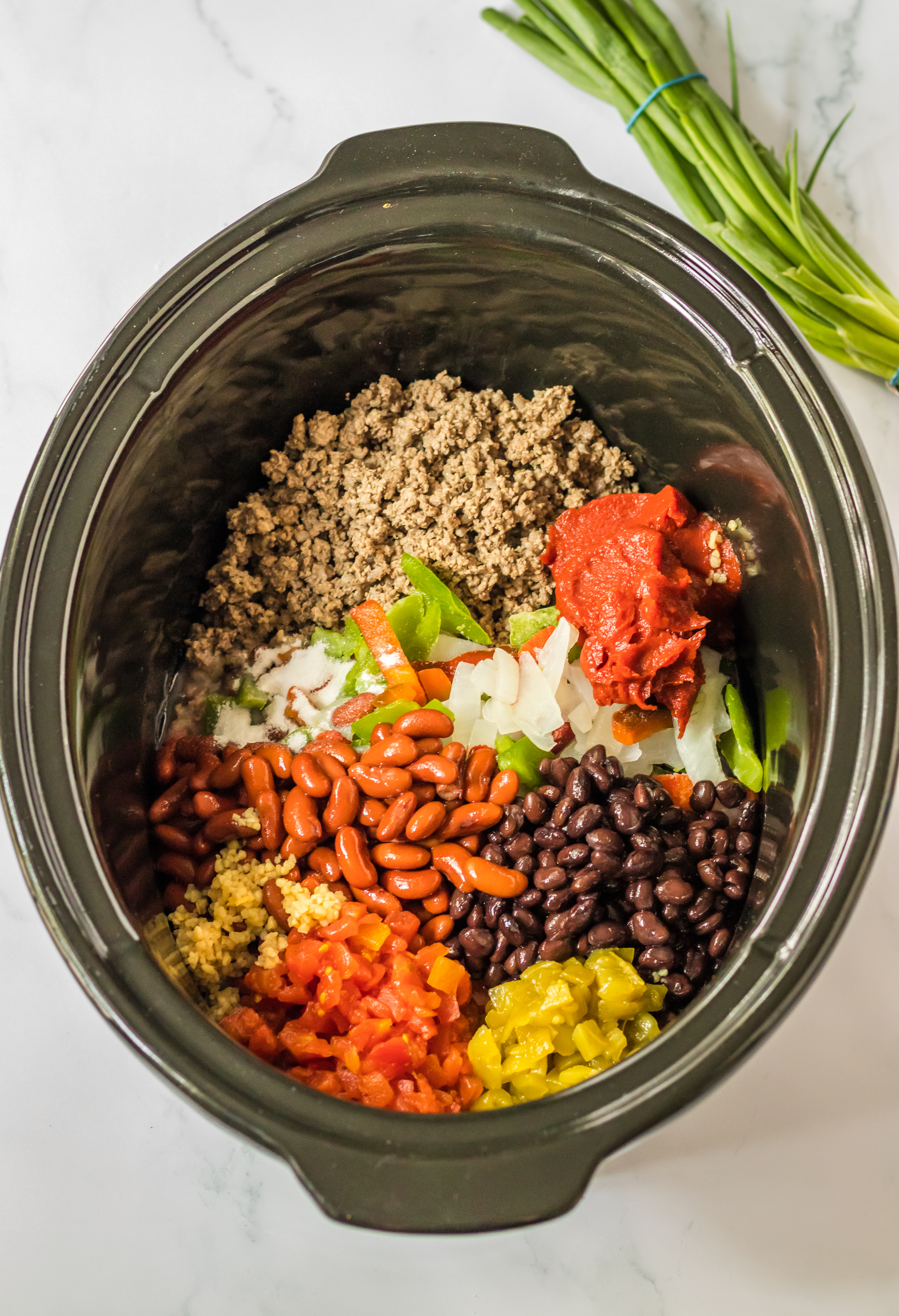 - To your slow cooker add the ground beef, onion and bell peppers, garlic, green chilies, tomatoes, tomato paste, red kidney beans, black beans, sugar and beef broth.