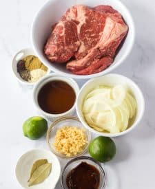 All you need to make this delicious beef, onion, garlic cloves, beef broth, lime juice, ground oregano, cumin, garlic salt, black pepper, cloves, chipotles in adobo, and bay leaves. I always have these ingredients on hand so that makes it easy to whip this up whenever we have a craving.