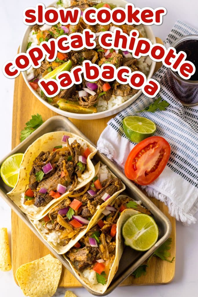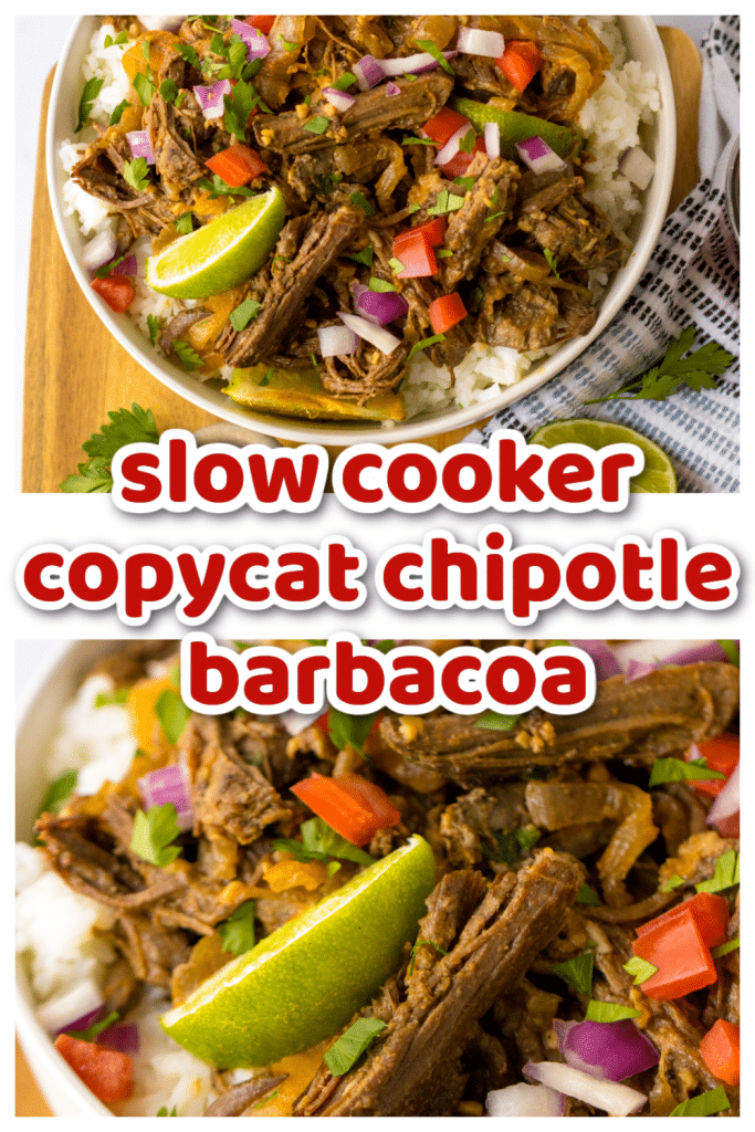 This Slow Cooker Copycat Chipotle Barbacoa is a delicious copycat of everyone’s favorite take out burrito place. Tender, flavorful beef cooks all day in the slow cooker and is perfect for burrito bowls, burritos or tacos.