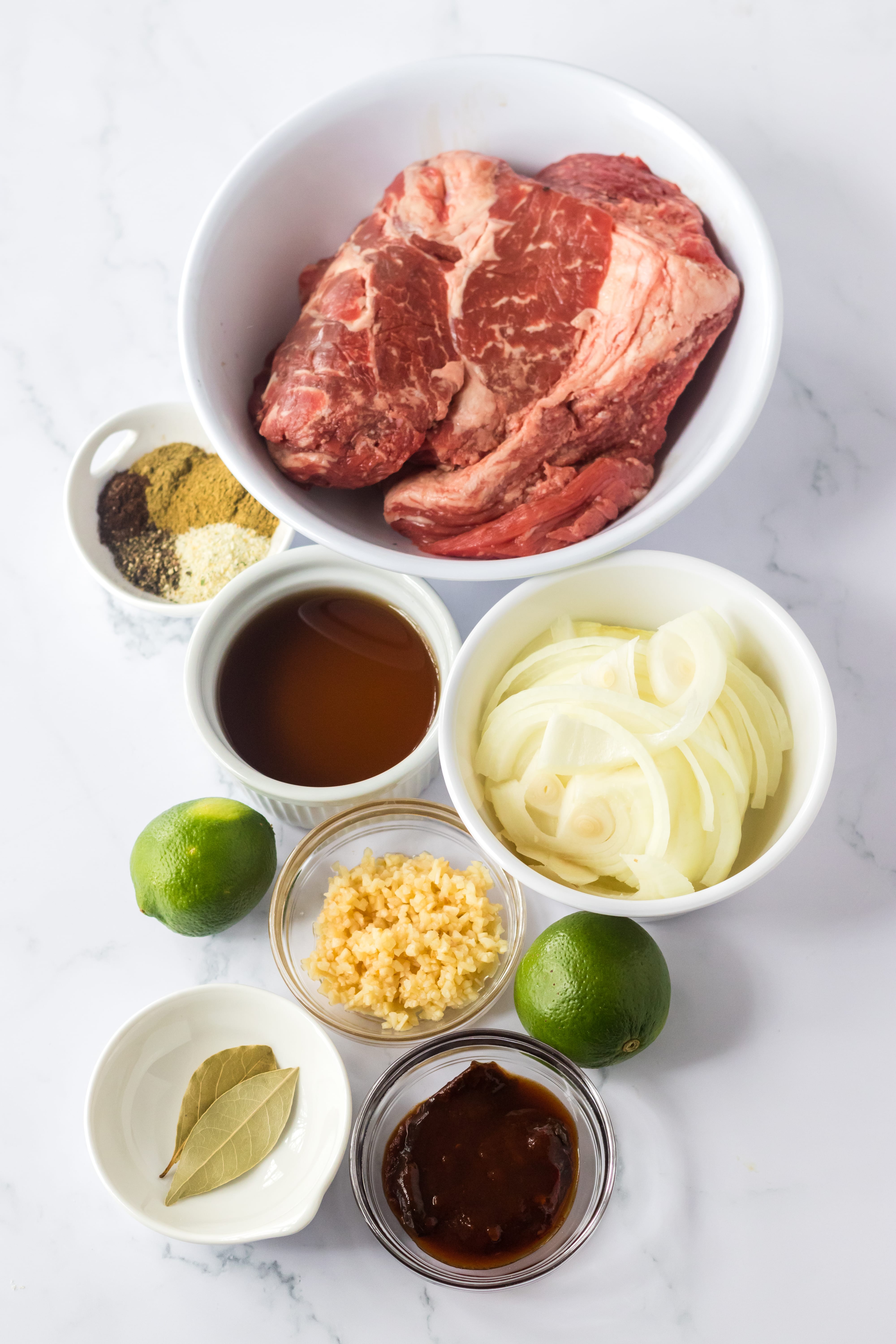 All you need to make this delicious beef, onion, garlic cloves, beef broth, lime juice, ground oregano, cumin, garlic salt, black pepper, cloves, chipotles in adobo, and bay leaves. I always have these ingredients on hand so that makes it easy to whip this up whenever we have a craving.