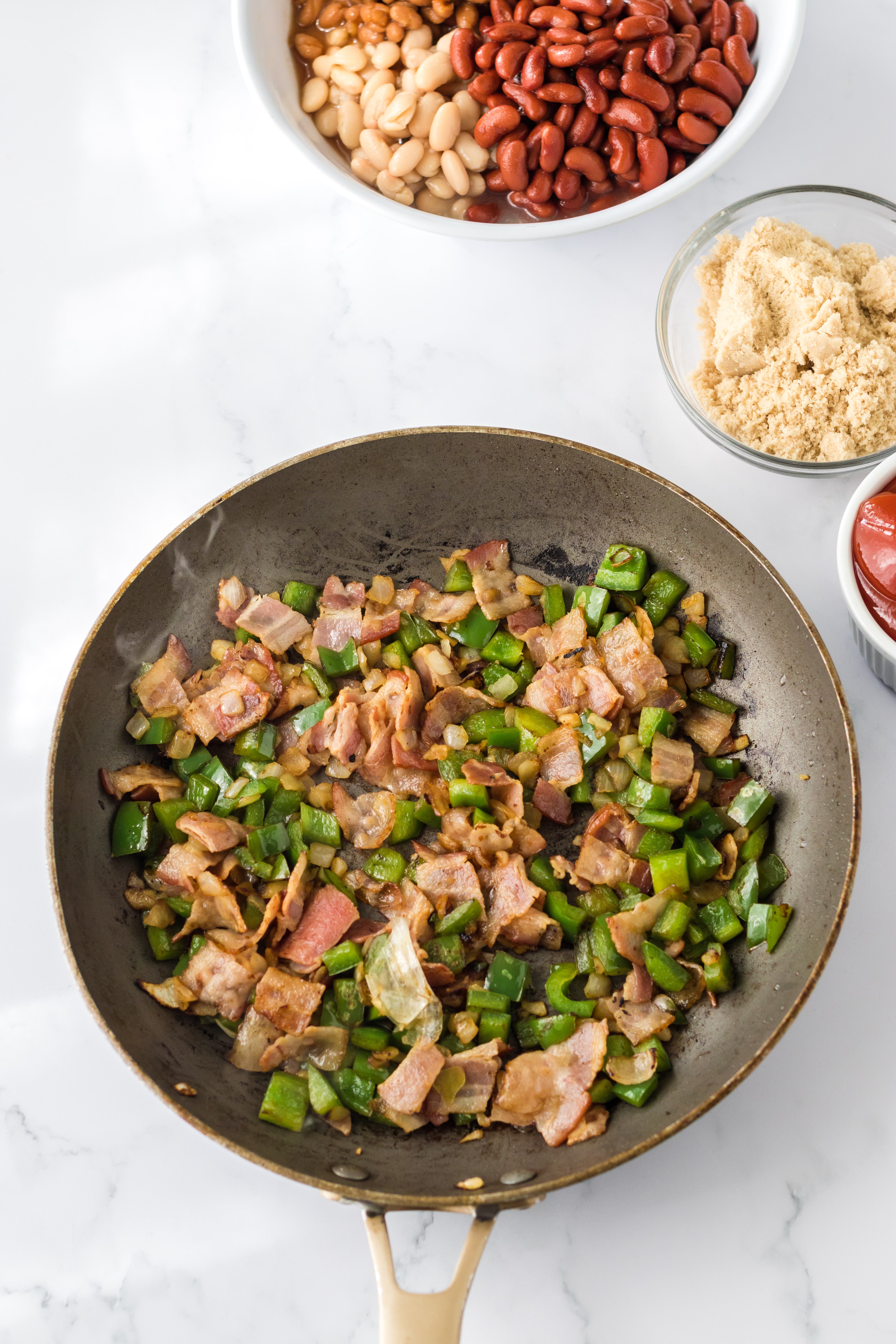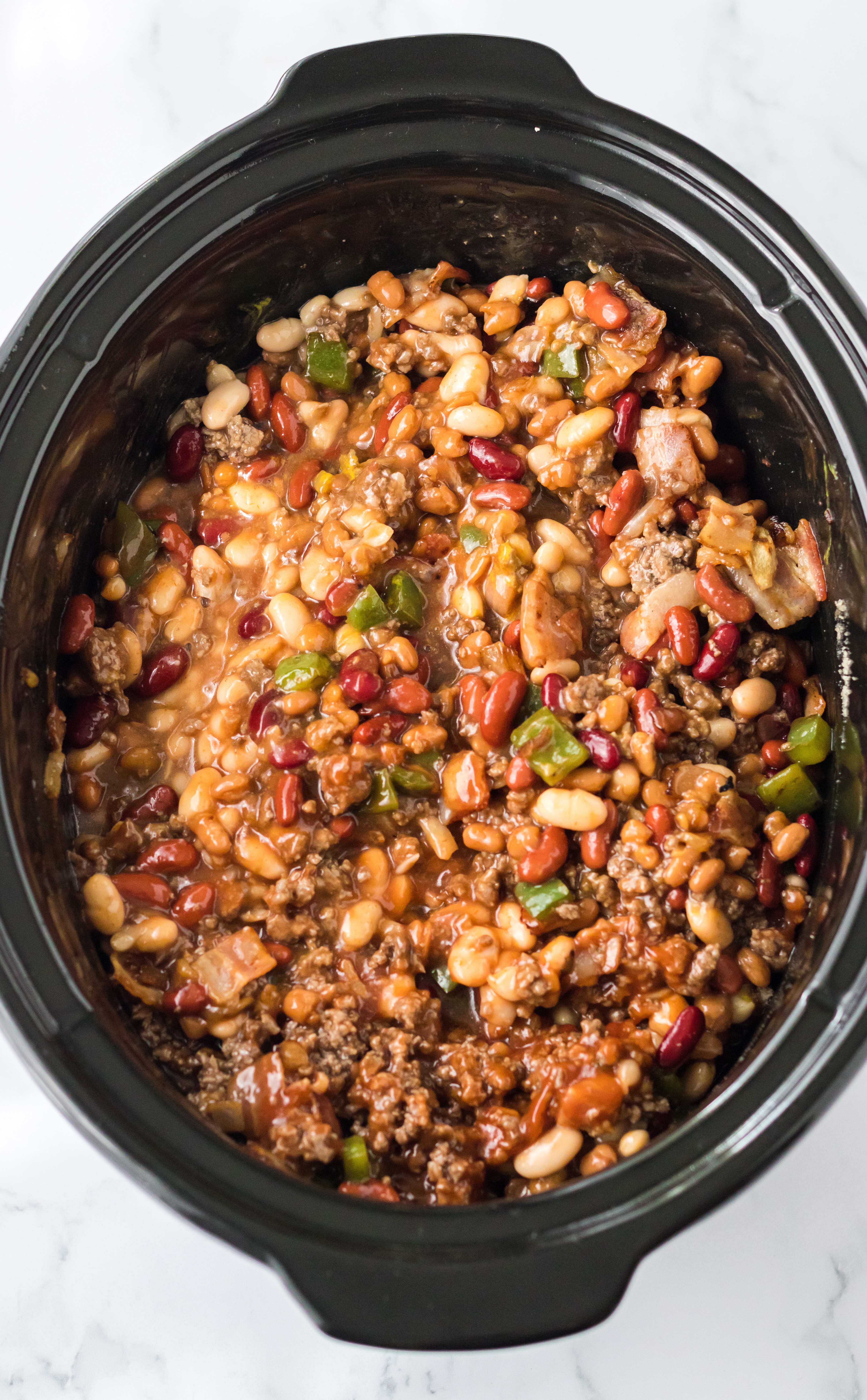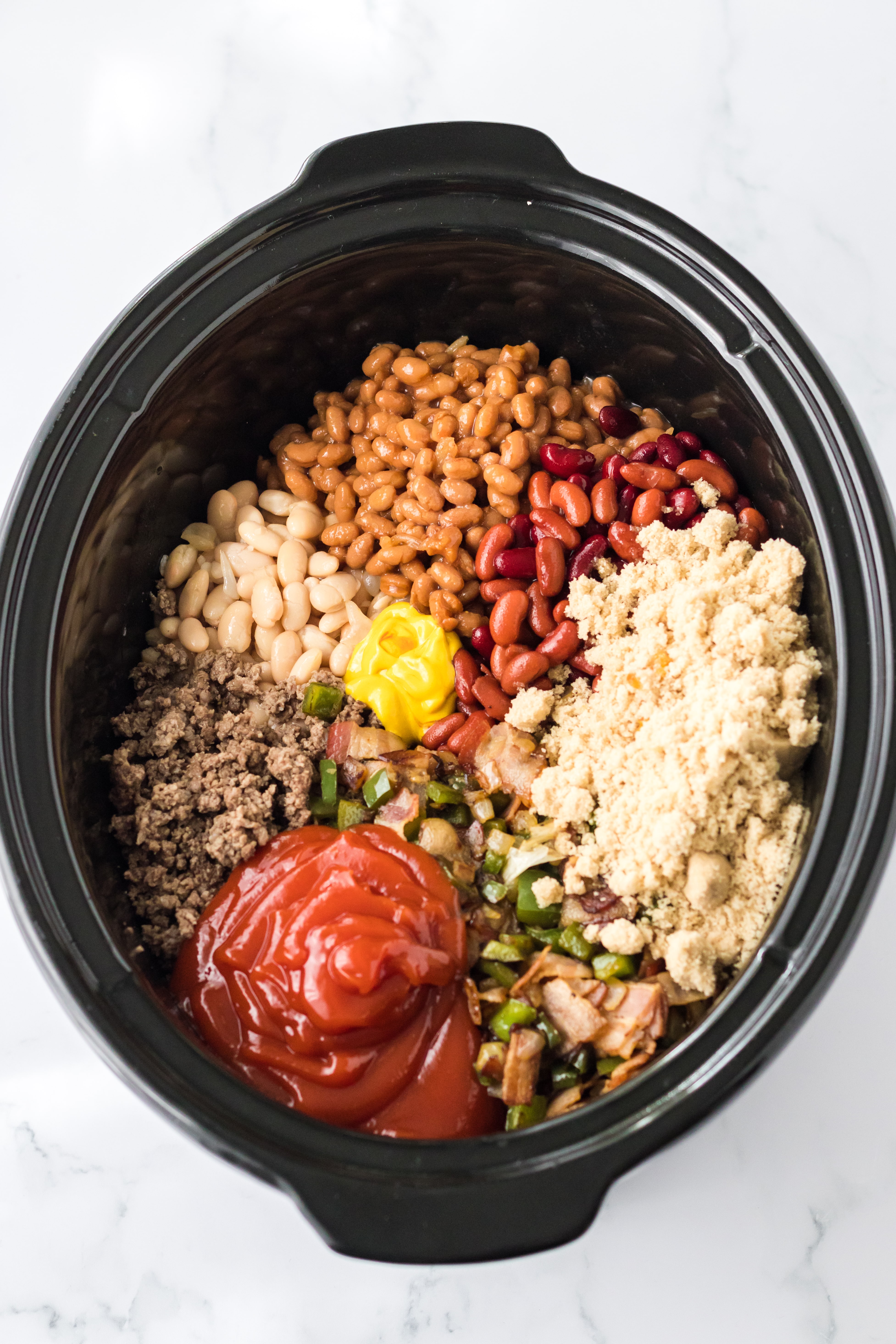 - To the slow cooker add the cooked drained beef, bacon, onion pepper mixture, pork and beans, northern beans, kidney beans, brown sugar, ketchup, vinegar and mustard.