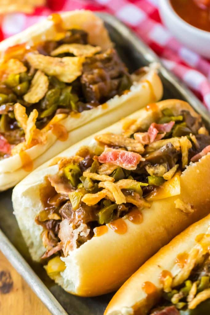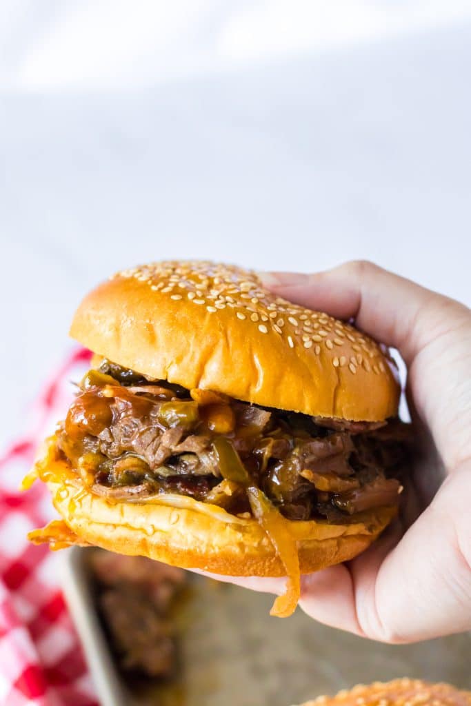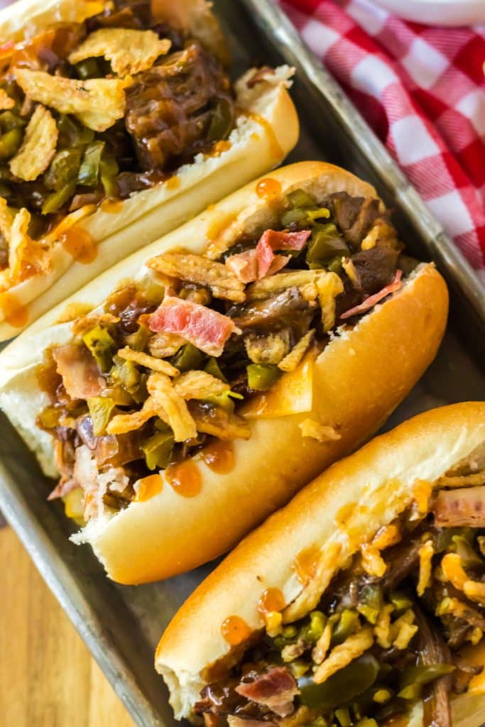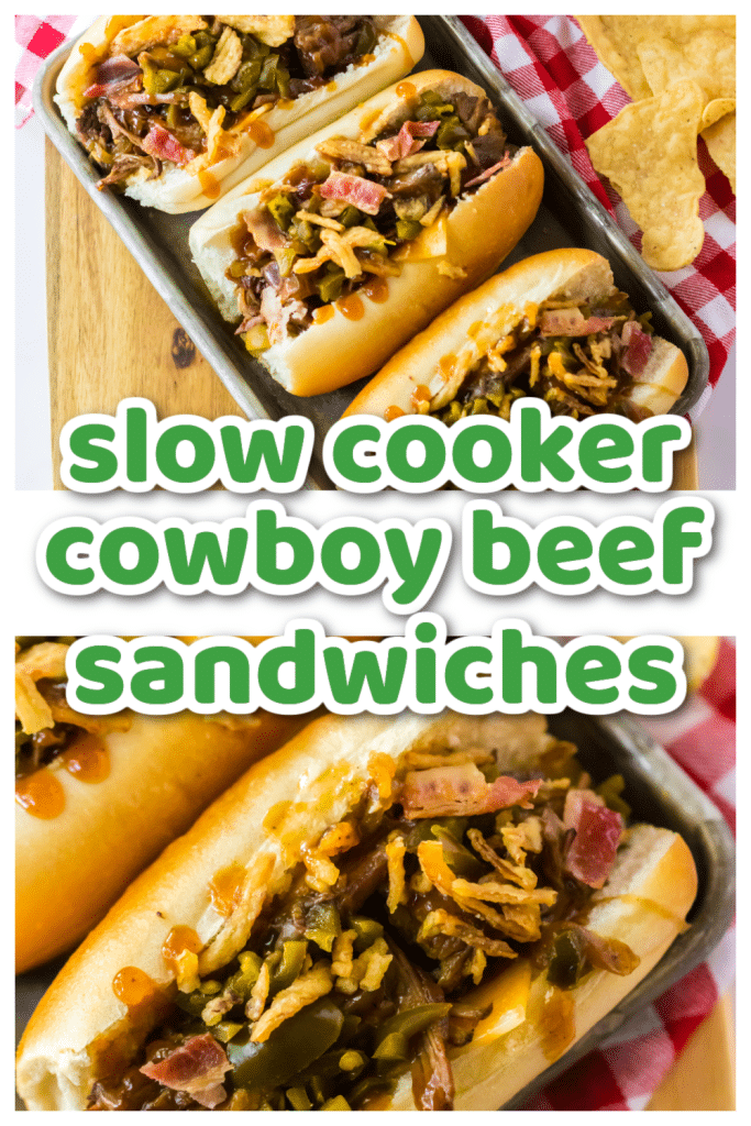 Looking for a new family-friendly dinner that will have everyone begging for seconds? Well, look no further because these Slow Cooker Cowboy Beef Sandwiches are about to become your new favorite go-to dish! Tender beef slow-cooks all day in a flavorful blend of bbq sauce, onion, jalapenos, bacon, brown sugar, garlic, and worcheshire sauce, creating a mouthwatering filling for soft buns or sub rolls. And for a little extra kick, top it off with melty cheese, more jalapenos, bacon, and crispy fried onions.