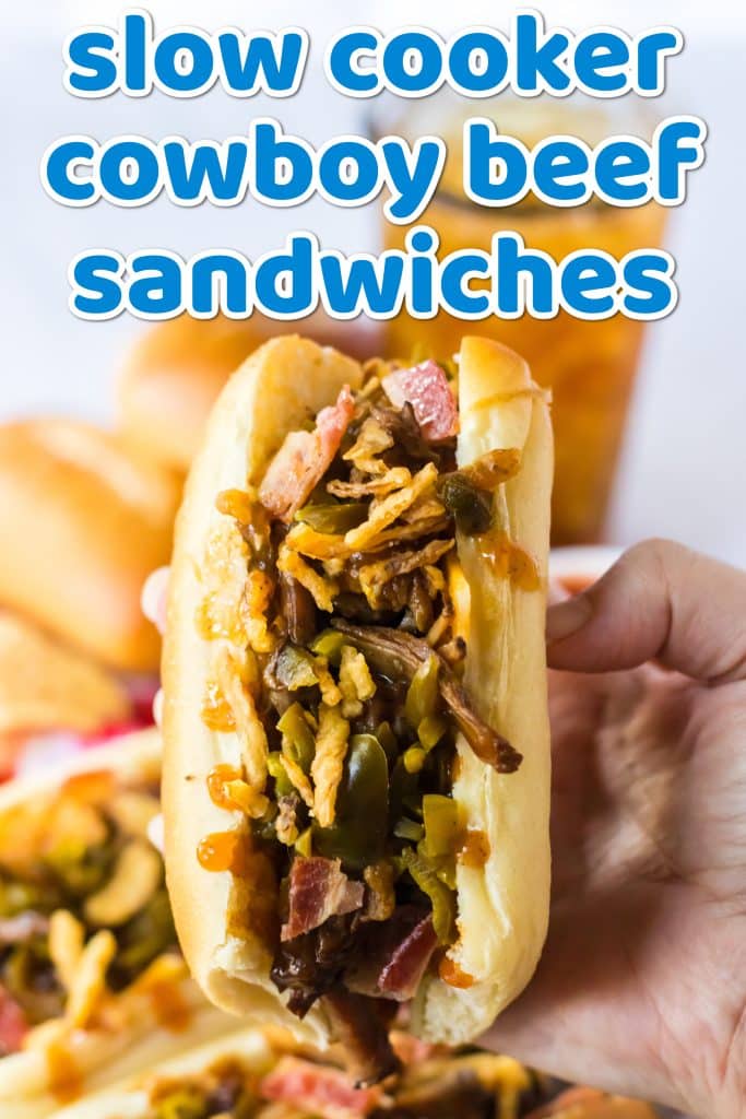 These Slow Cooker Cowboy Beef Sandwiches are going to be your new favorite dinner! Tender beef cooks all day in a sauce of bbq sauce, onion, jalapenos, bacon, brown sugar, garlic and worcheshire sauce. We pile this on buns with melty cheese, more jalapenos and bacon and top it off with crispy onions!
