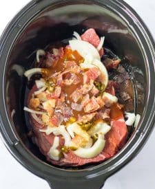 - Into the slow cooker place beef, bbq sauce, half of the cooked bacon, the onion, worcheshire sauce, garlic, brown sugar and half of the jalapenos.