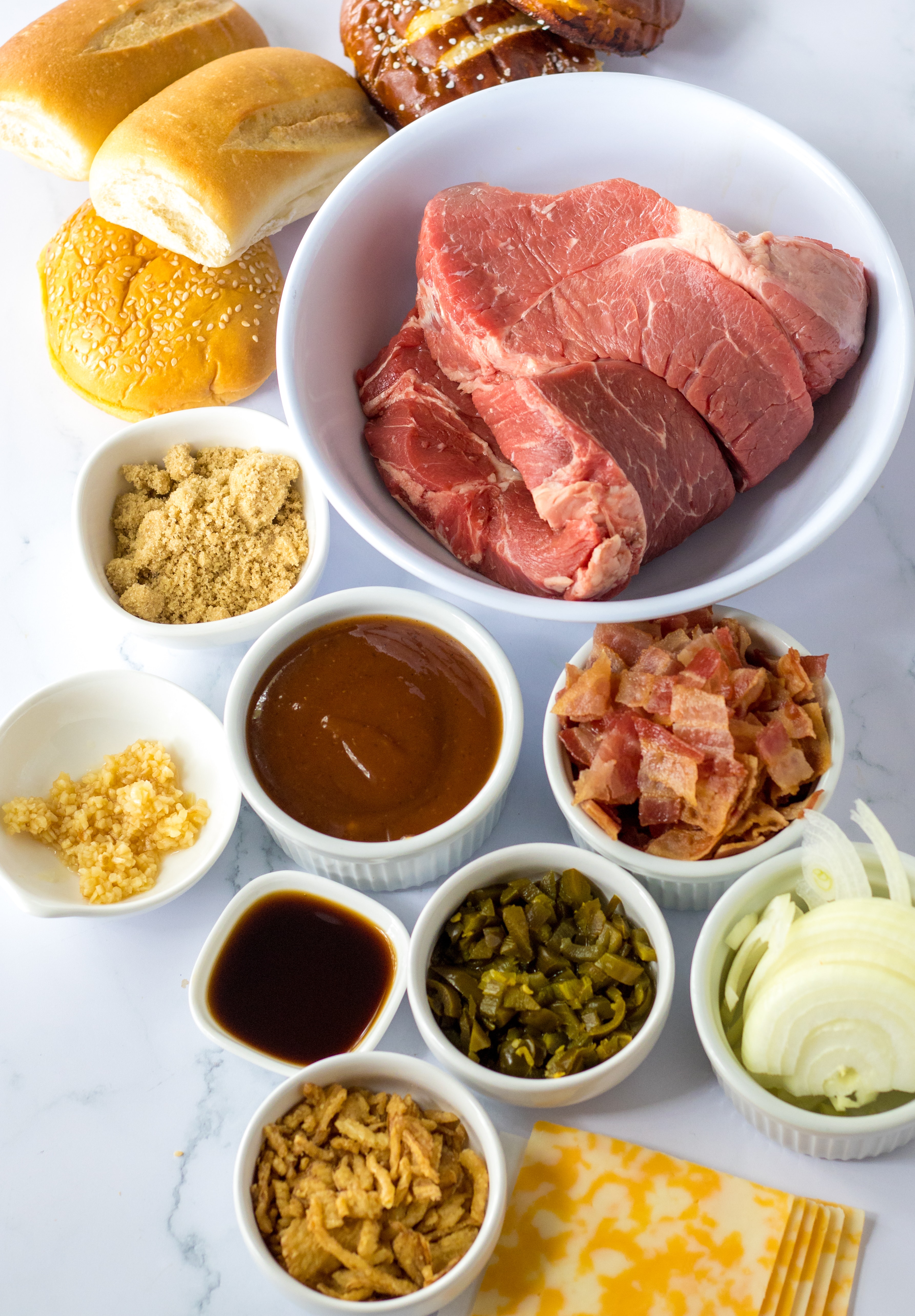 - Buns – I like to use brioche buns or sub rolls, but these also make great sliders. You can even use hoagie rolls or onion kaiser rolls. Any crusty rolls will be great!