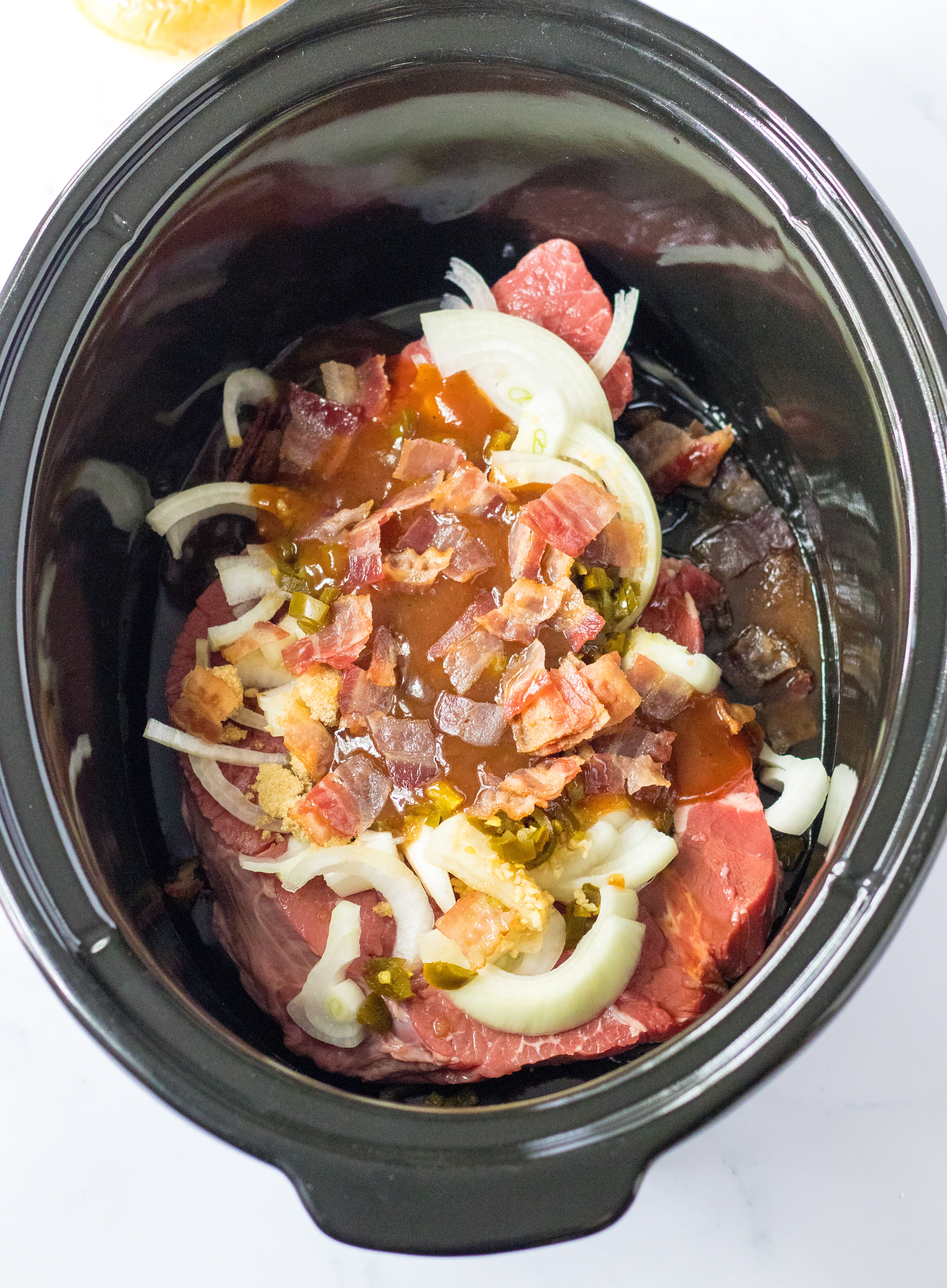 - Into the slow cooker place beef, bbq sauce, half of the cooked bacon, the onion, worcheshire sauce, garlic, brown sugar and half of the jalapenos.