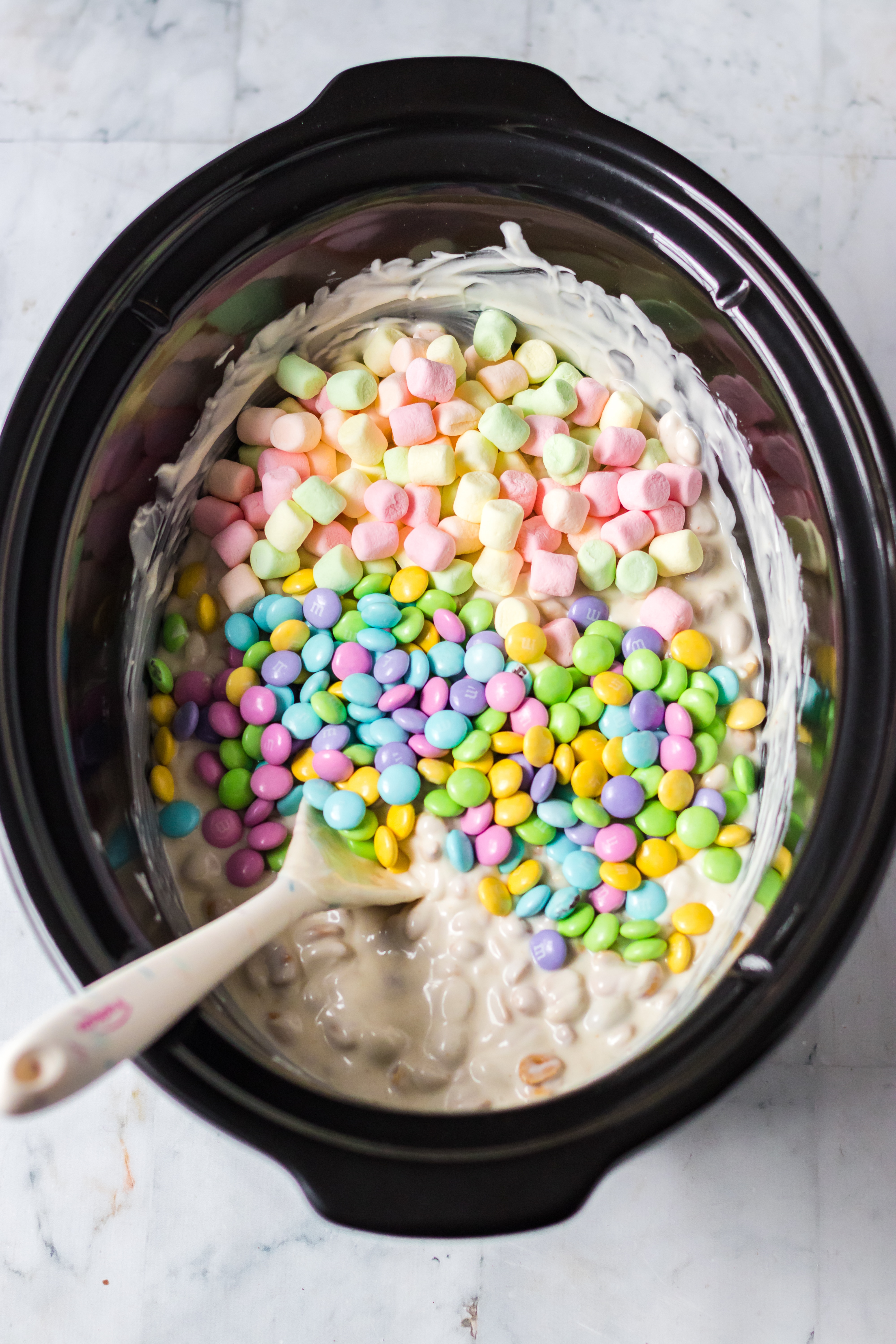 This Slow Cooker Easter Candy is my new favorite holiday treat! Peanuts and white chocolate get melty in the slow cooker before stirring in mini marshmallows and pastel M&Ms. A few Easter sprinkles and these candies are ready for the Easter Bunny!