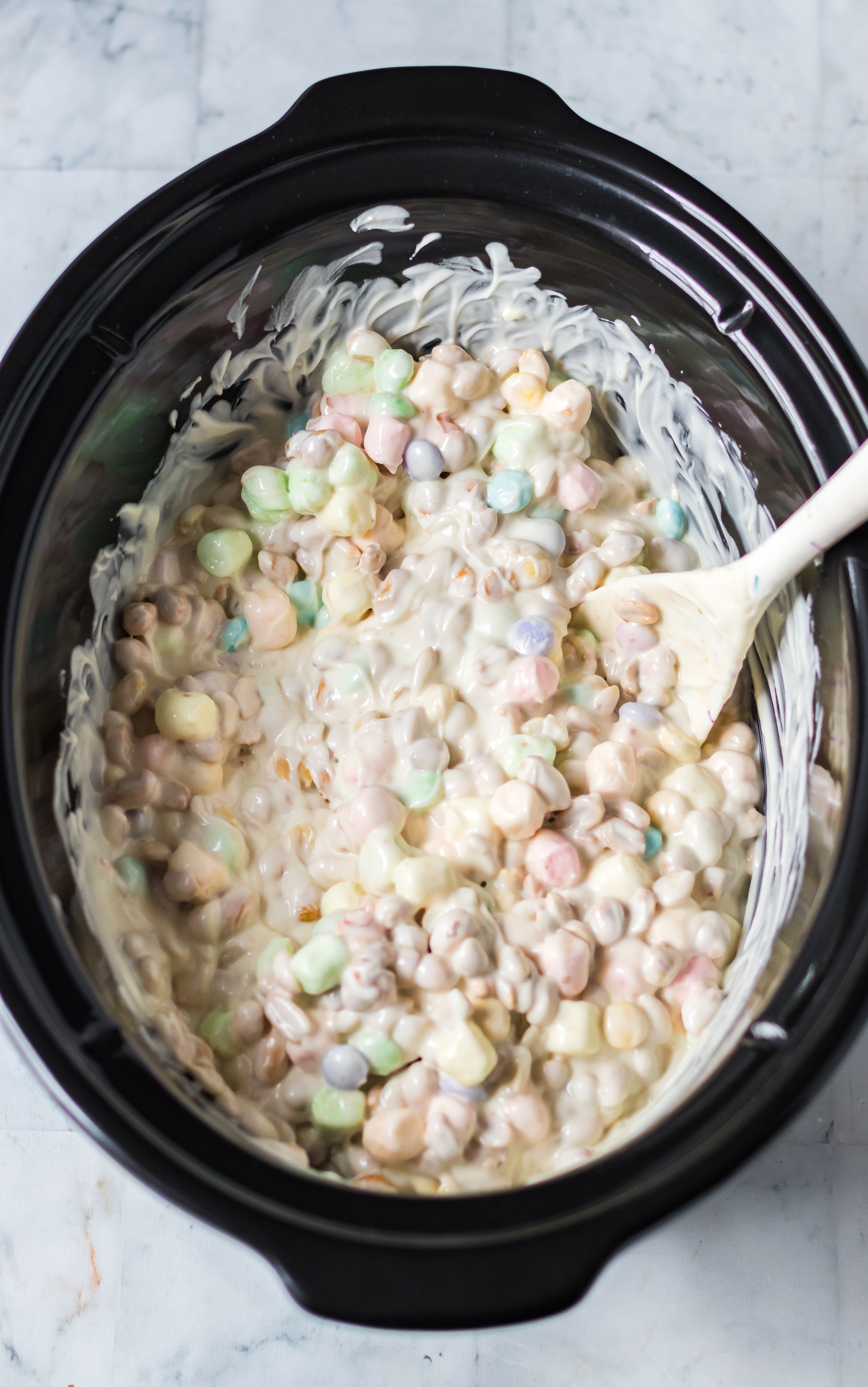 chocolate get melty in the slow cooker before stirring in mini marshmallows and pastel