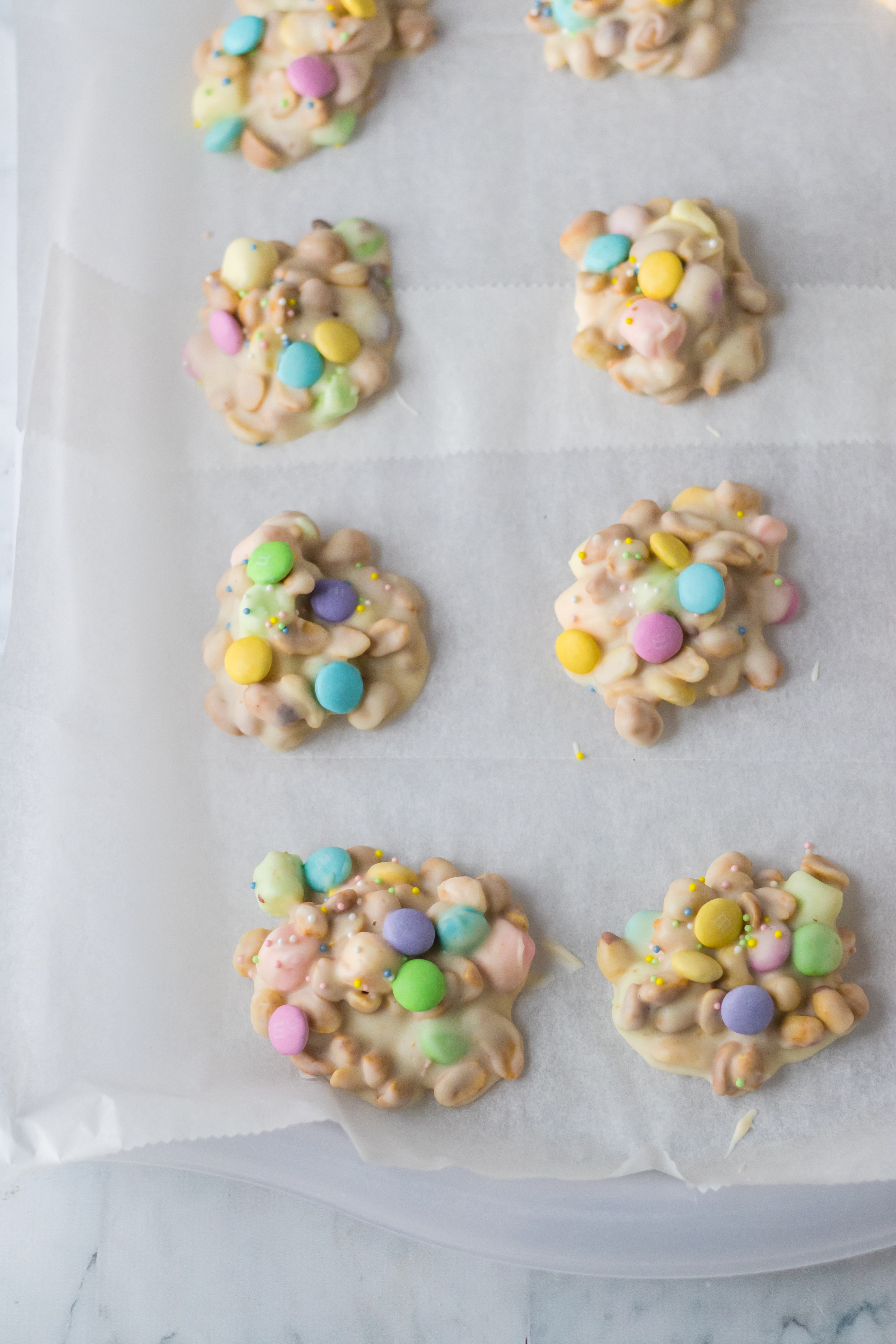 There is nothing I love more during the holidays than a cute dessert treat. This Easter candy is the perfect dessert or treat for your Easter table. With white chocolate, peanuts, mini marshmallows and M&Ms this is as delicious as it is adorable.