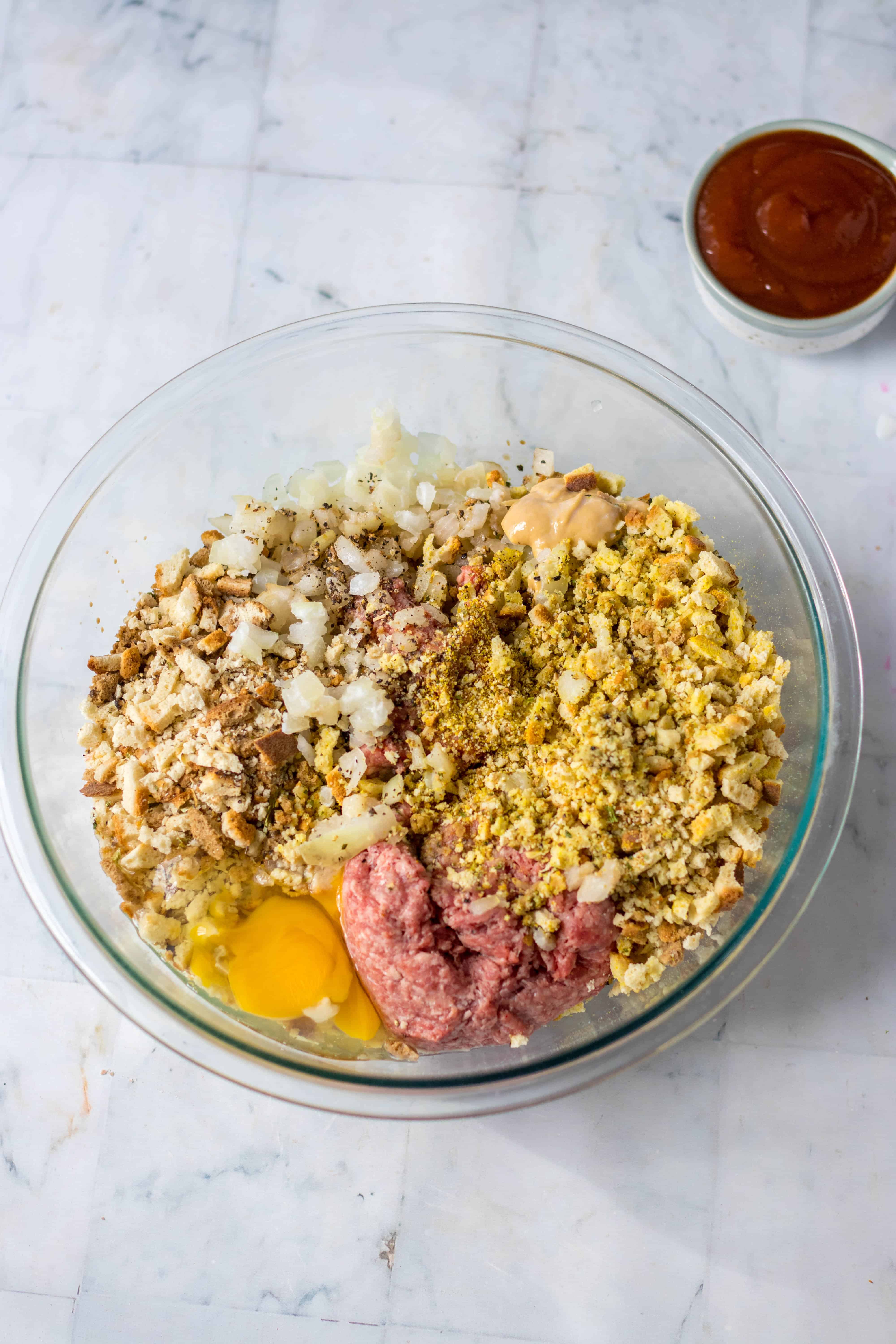 - In a large mixing bowl combine the ground beef, onion, stuffing, milk,worcheshire sauce, steak seasoning, pepper, 1 tablespoon of mustard and the 2 eggs.
