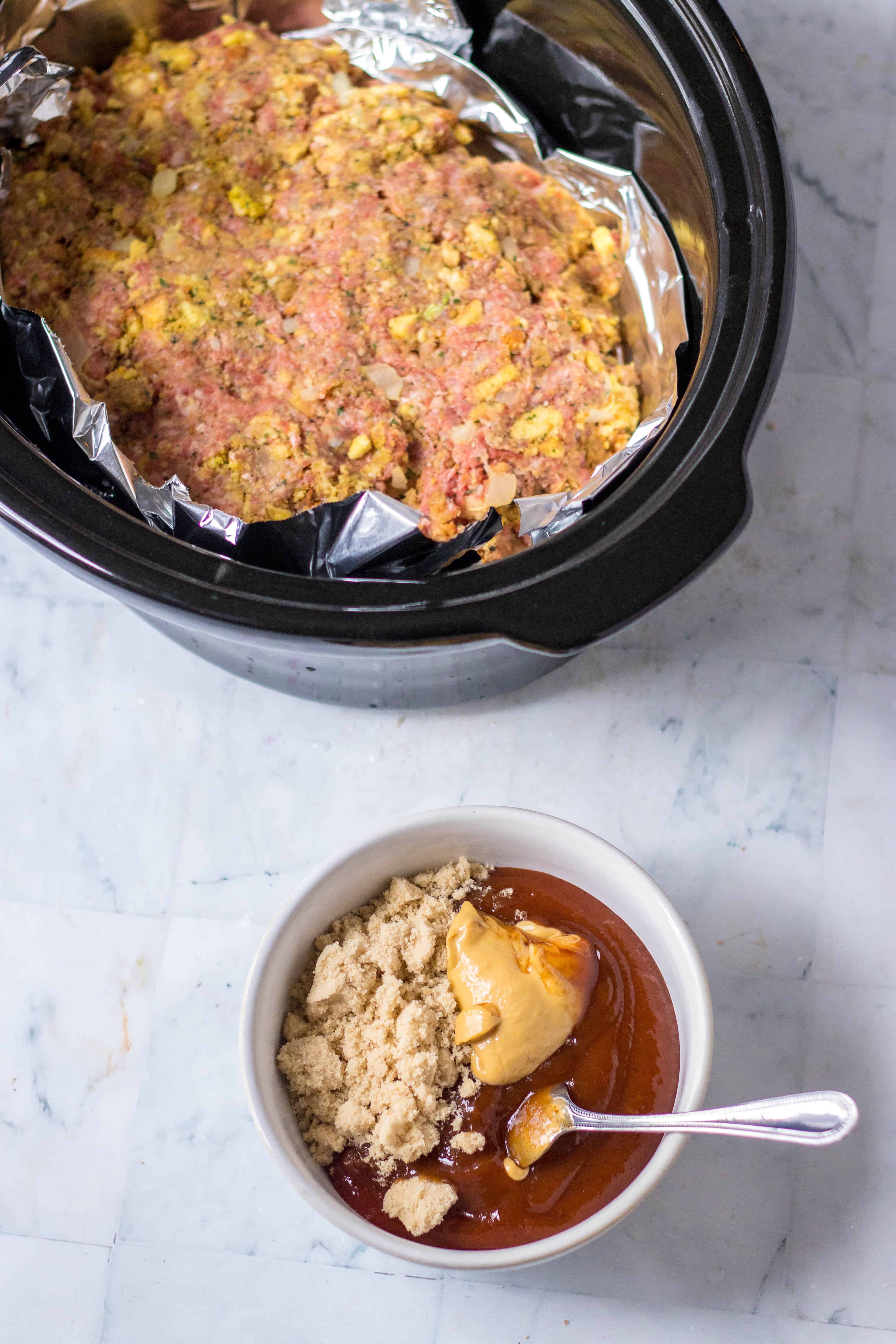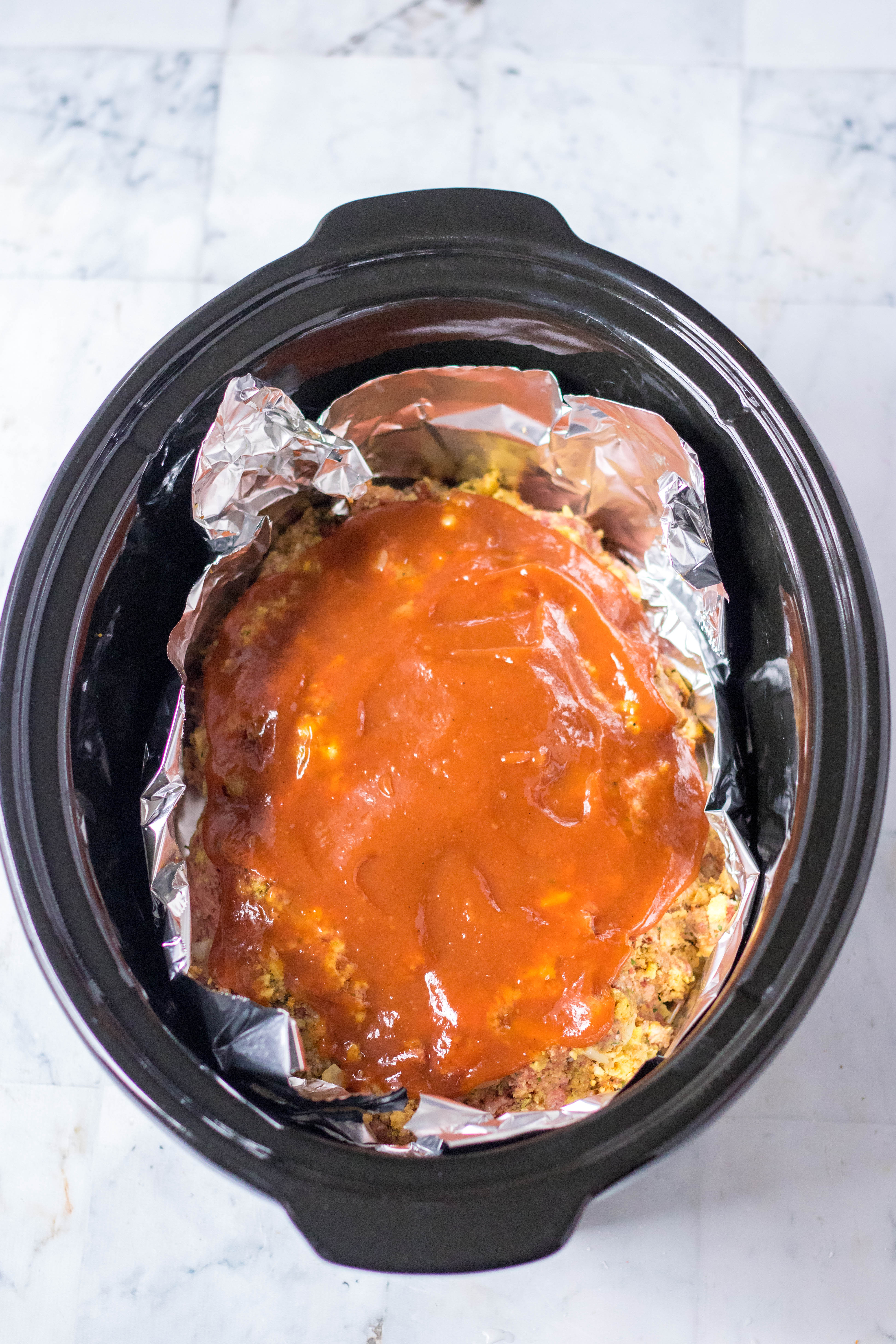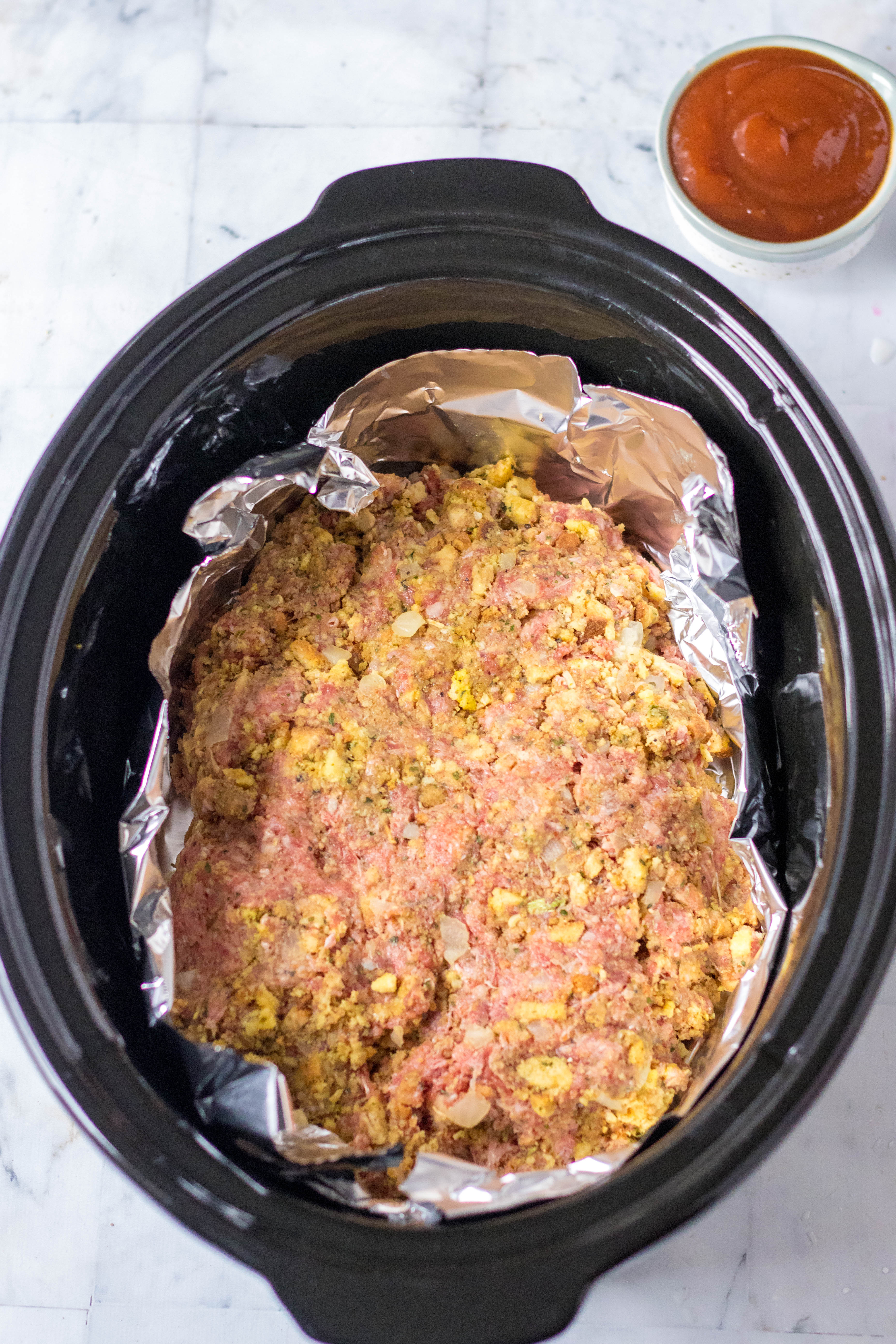 - Line your slow cooker with heavy duty foil and place the meat mixture into the slow cooker and form into a loaf.