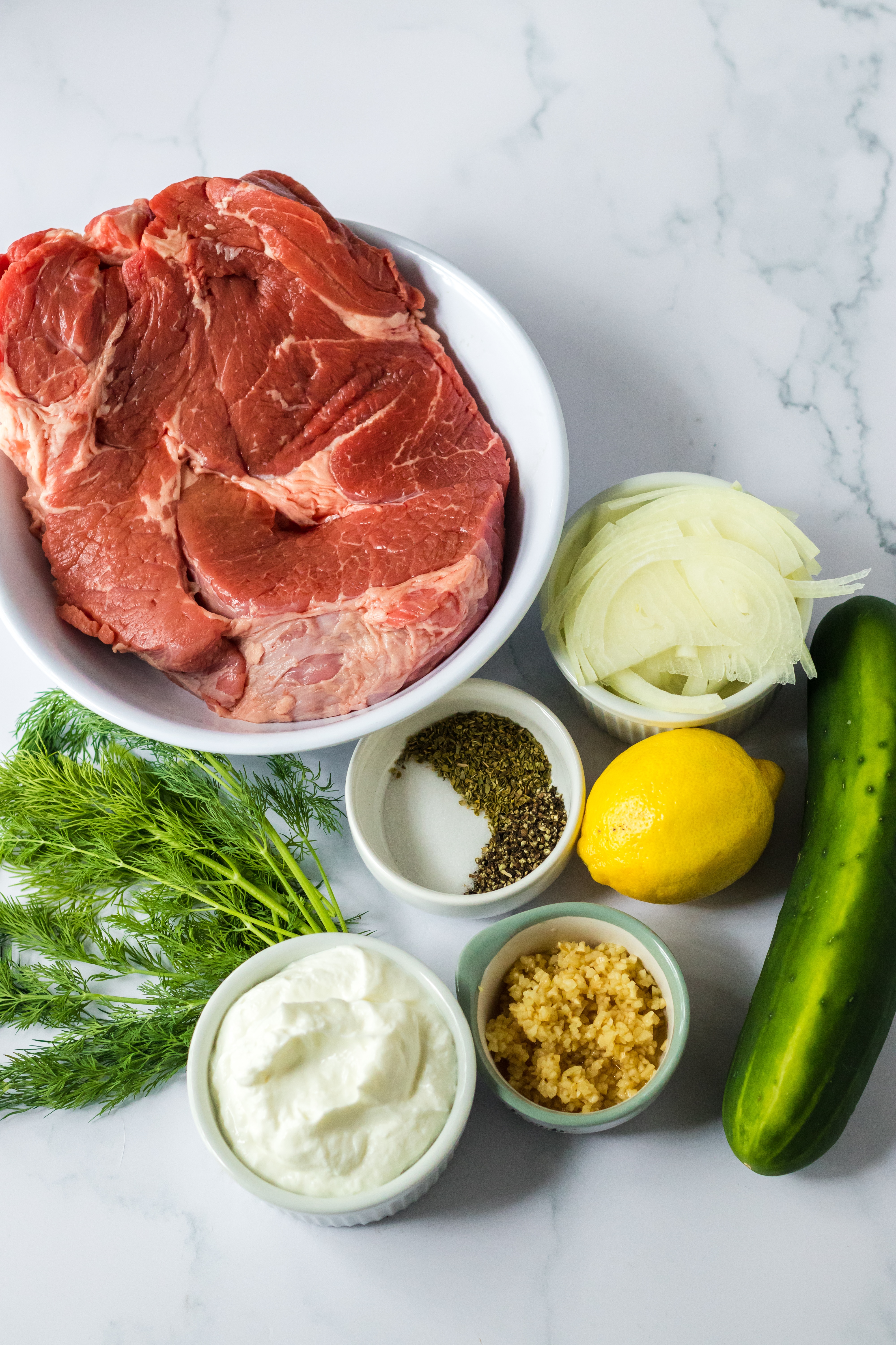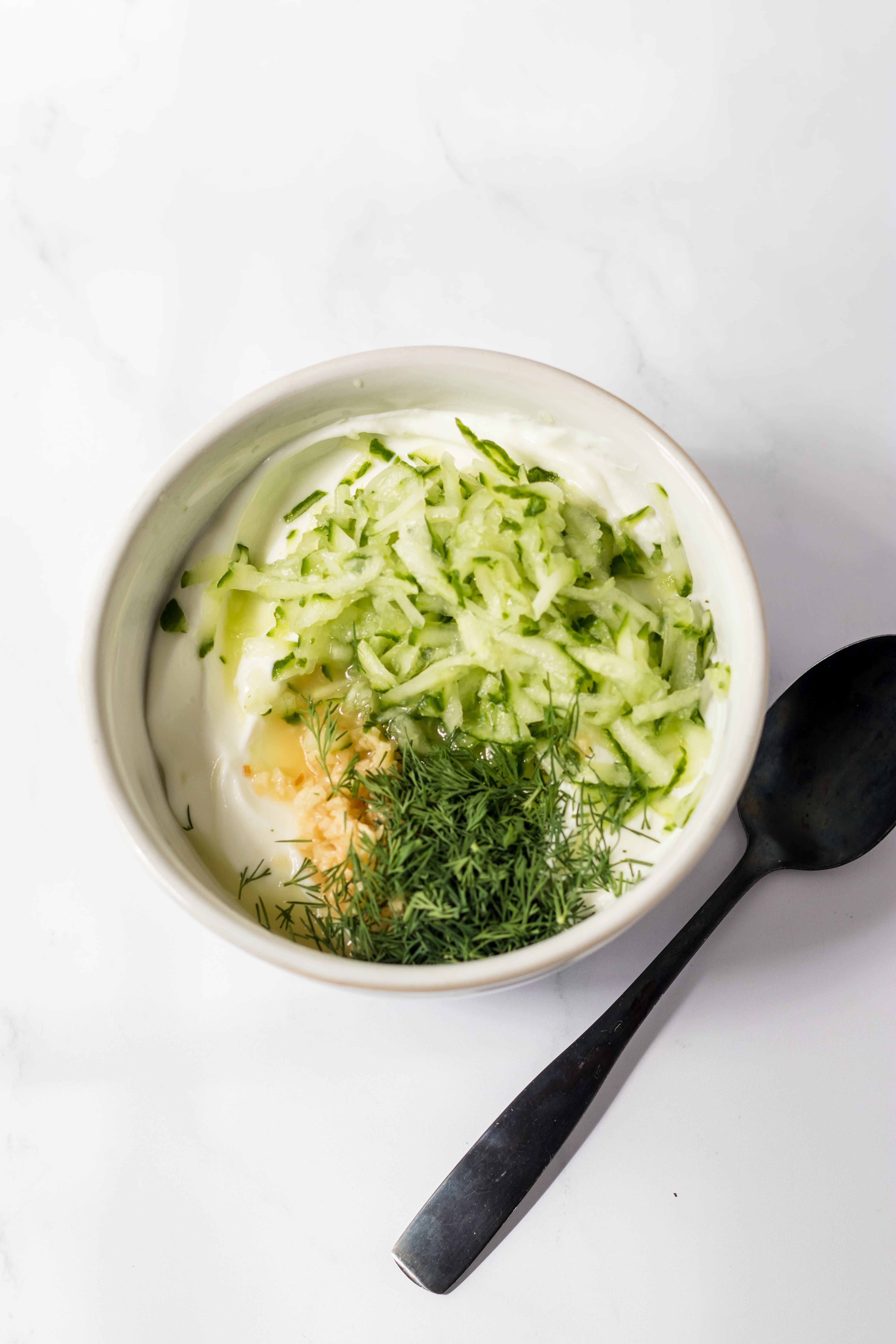 - In a small mixing bowl combine the yogurt, cucumber, lemon juice, garlic, salt and dill.