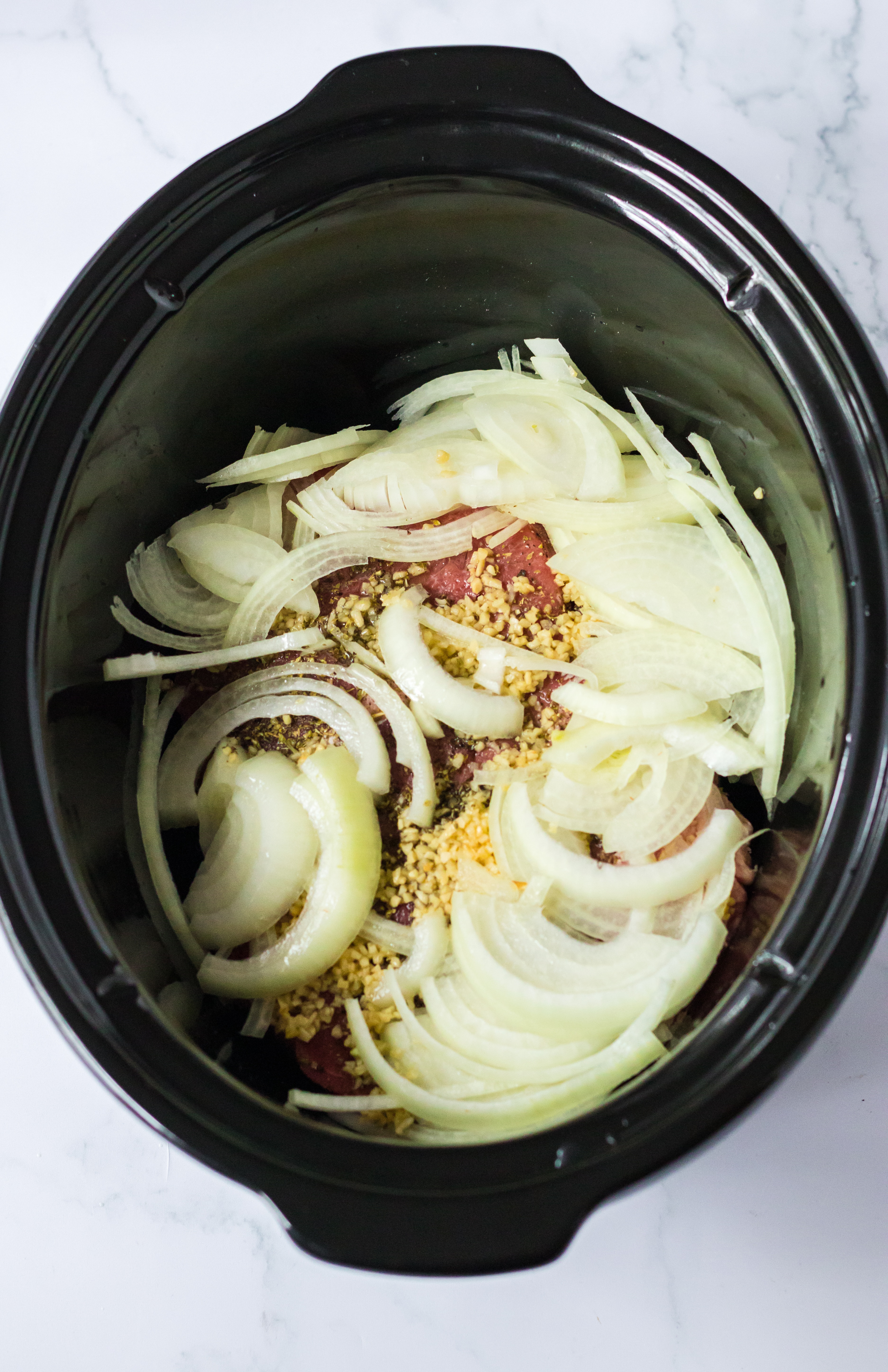 1. In your slow cooker place the roast.