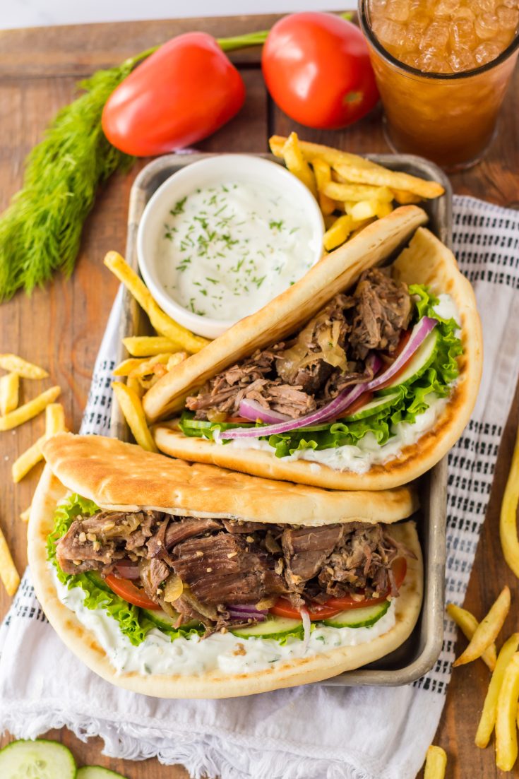These gyros slow cook up nice and tender and are perfect piled in a pillowy pita.