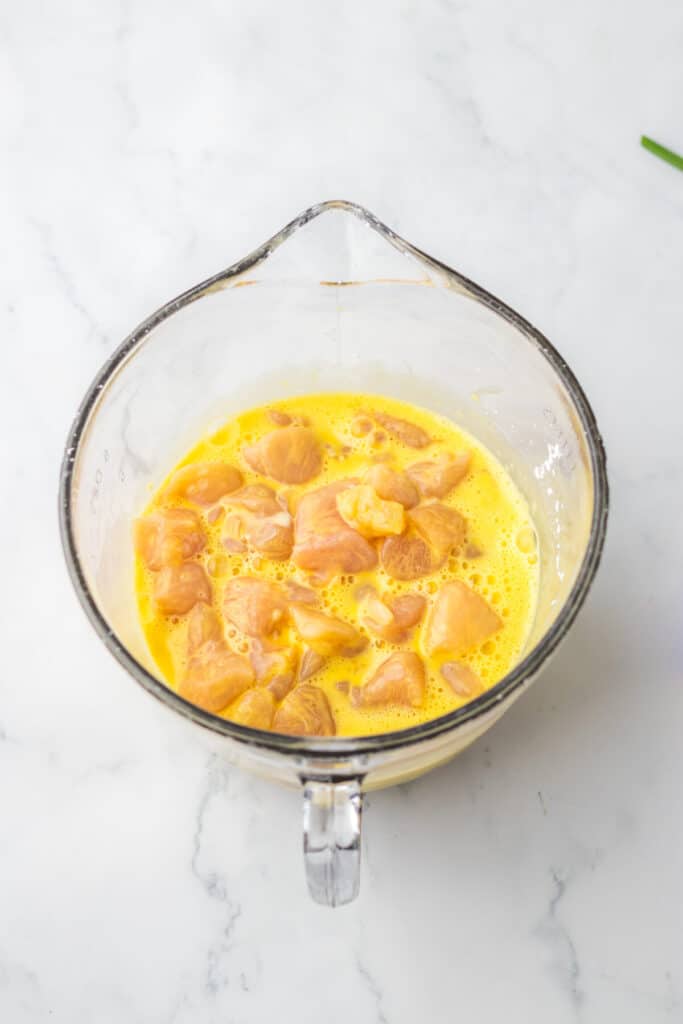 - Coat your chicken pieces in cornstarch egg mixture.