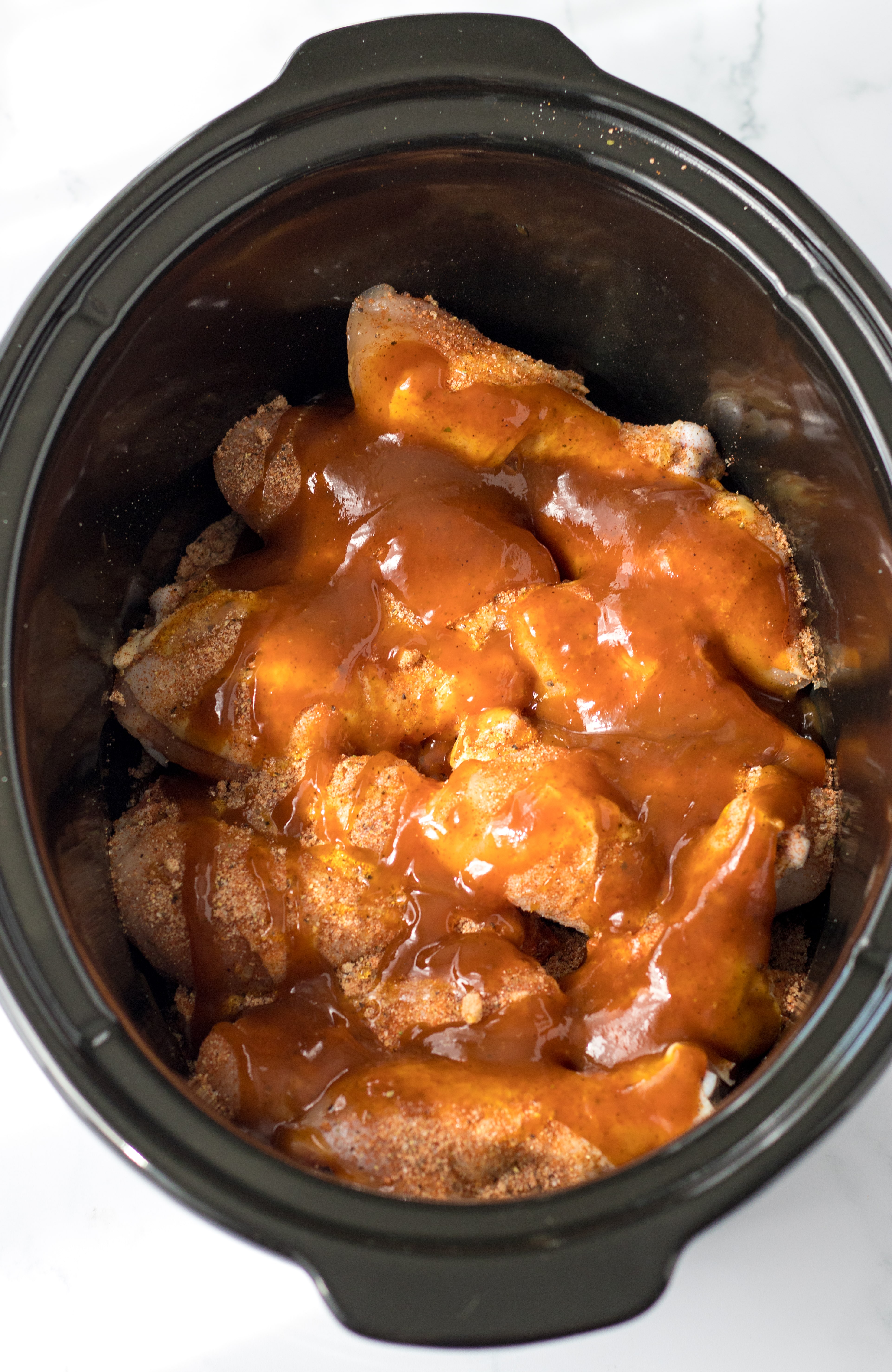 5. Pour 1 ½ cups of the bbq sauce into the slow cooker over the chicken.