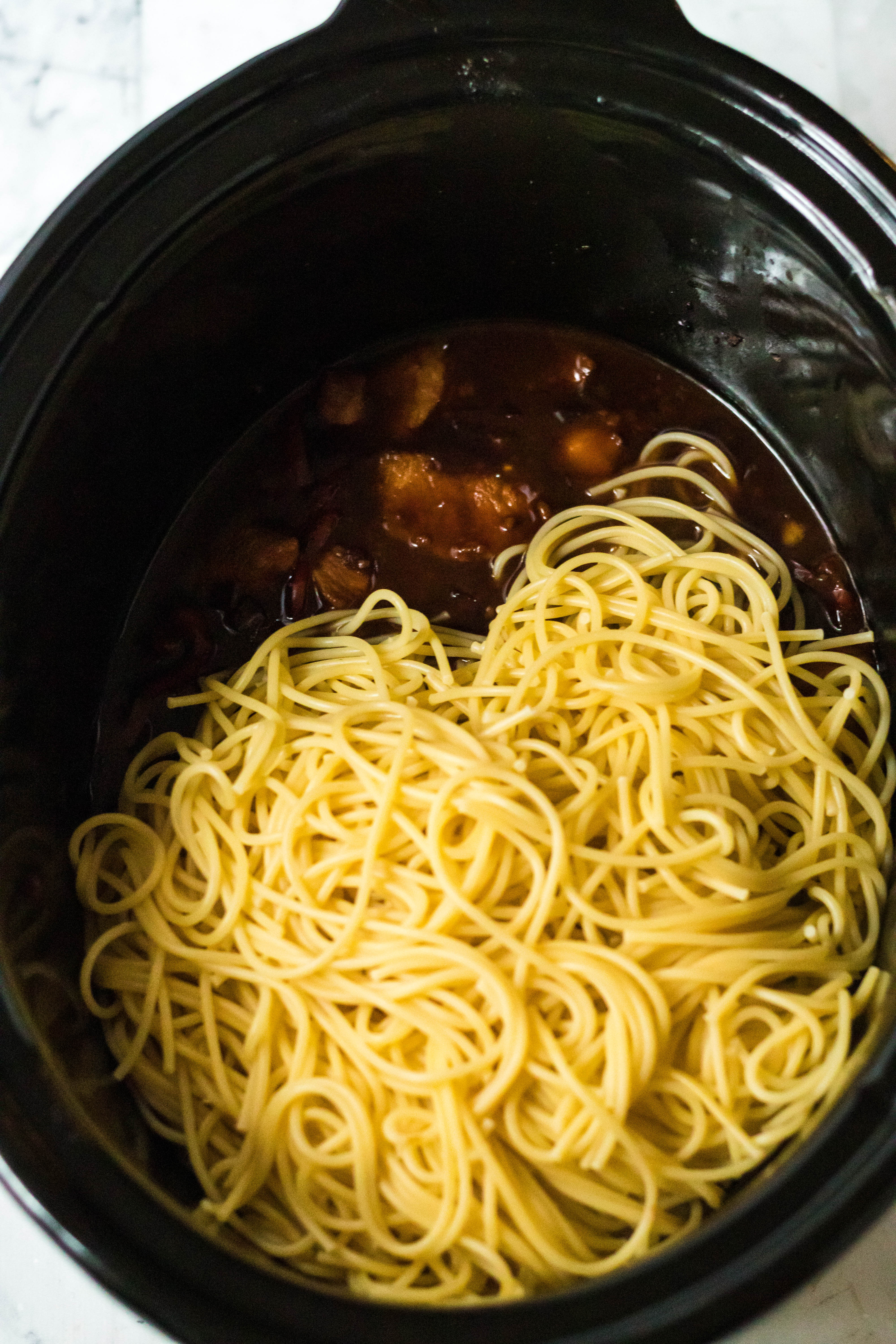 Slow cooker shot of the Slow Cooker Honey and Garlic Chicken and Noodles